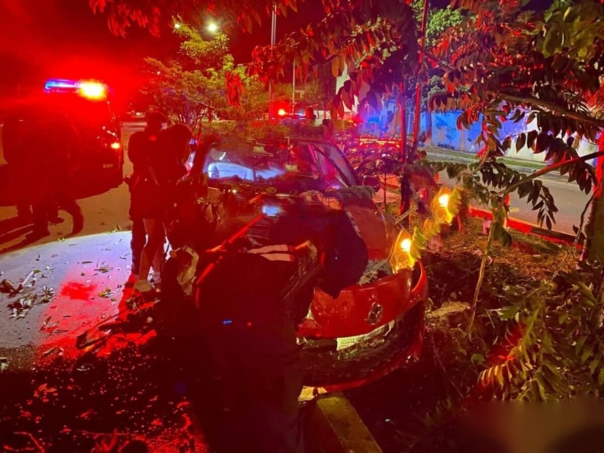 Esto provocó que el vehículo se precipitara contra el camellón central, donde impactó los árboles que están sembrados en medio y además golpeara un poste de alumbrado público, terminando con severos daños.