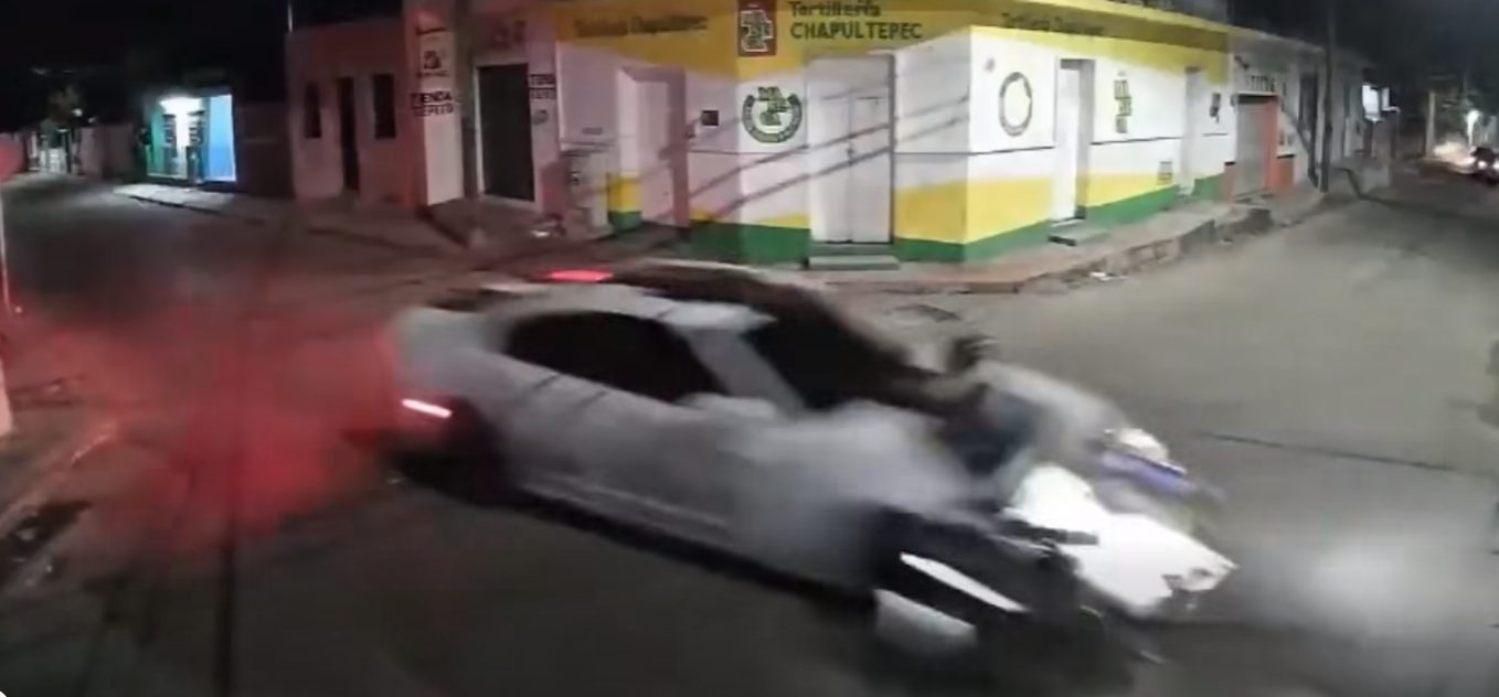 Una cámara de vigilancia instalada en la esquina captó el momento en que el automóvil un deportivo blanco con cofre oscuro y franjas rojas se “vuela” el alto de la calle 59 y embiste a la motocicleta que llevaba la preferencia.