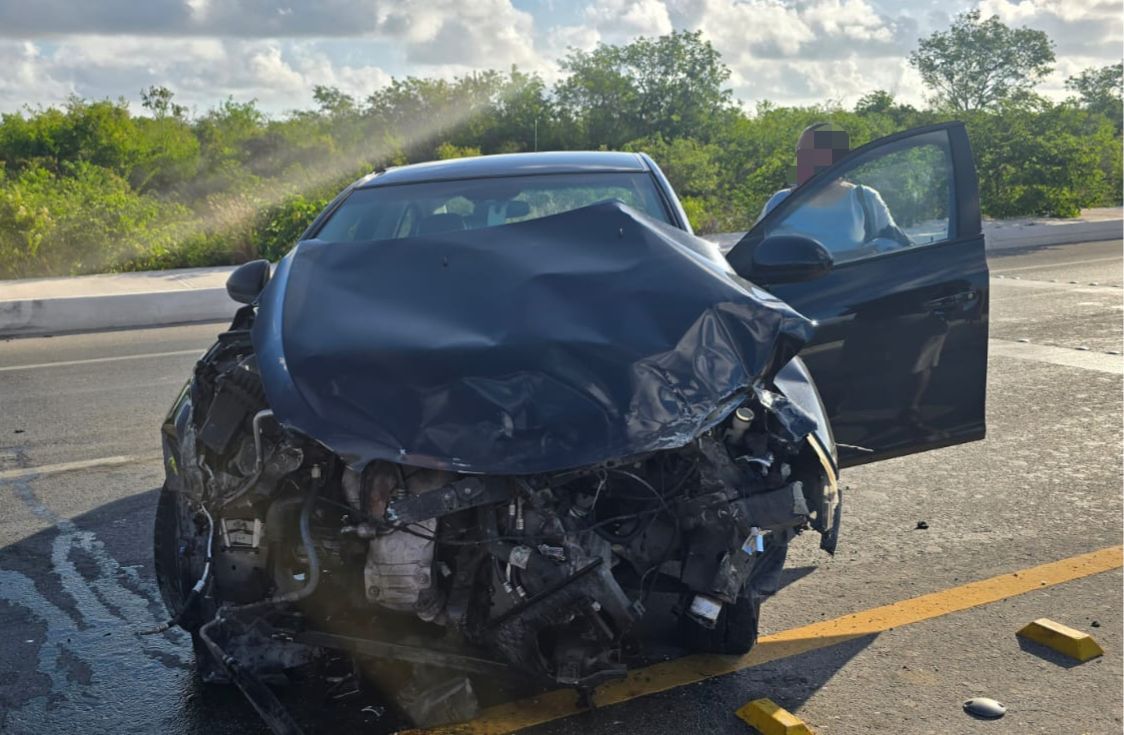 Cancún, 9 de junio. – La mañana de este lunes se registró un accidente de tránsito en la intersección de la avenida Chac Mool con avenida Mayorca, luego de que el conductor de un automóvil particular perdiera el control de su vehículo en una curva cerrada e invadiera el carril contrario, impactando contra un tráiler.