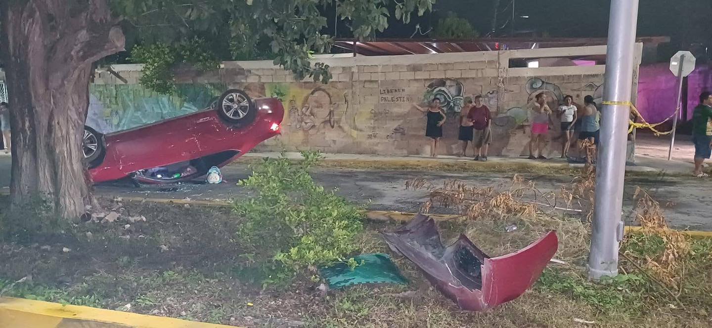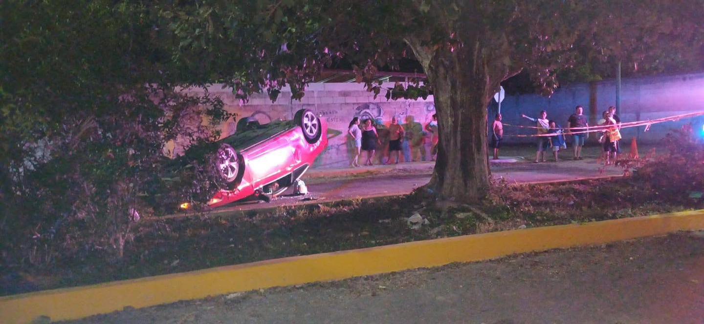 Chetumal, 15 de septiembre.- Un aparatoso accidente ocurrió durante la noche en la colonia SUTAGE, luego de que un conductor perdiera el control de su vehículo compacto con placas del estado de Yucatán, provocando una volcadura.