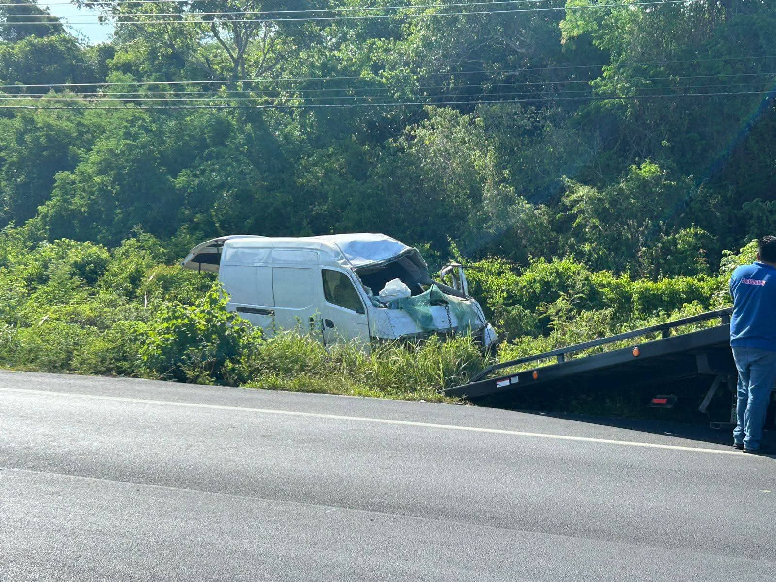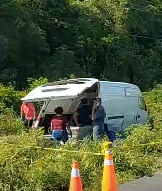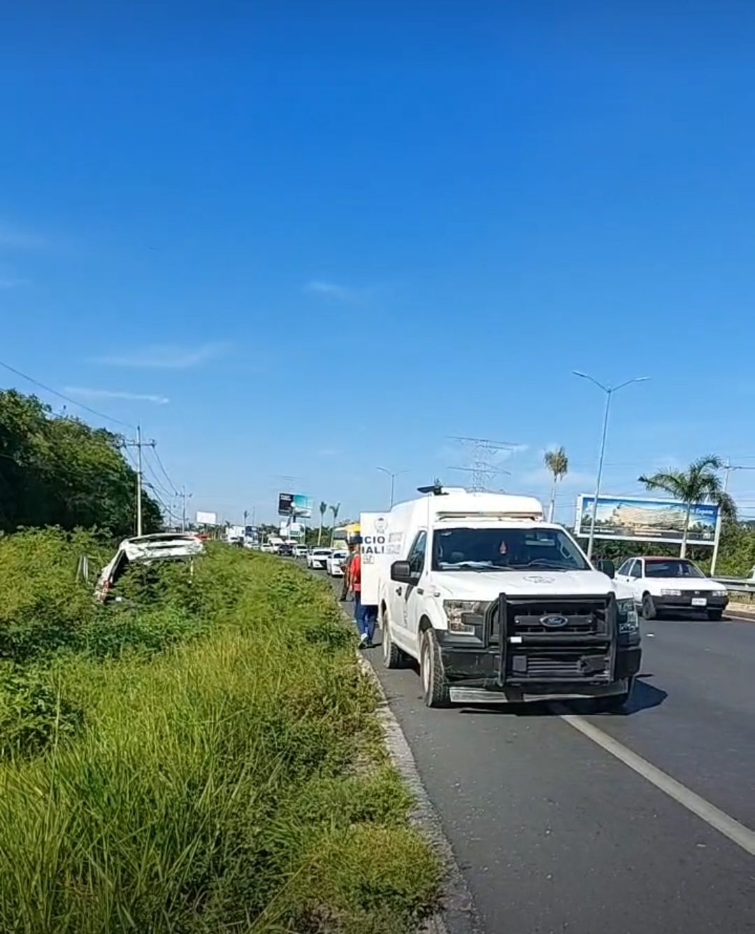 Playa del Carmen, a 08 de agosto de 2025.- El conductor de una camioneta blanca de paquetería (placas UTN-856-K) aparentemente perdió el control en la curva de Punta Maroma, saliéndose de la carretera y volcando la unidad, del impacto el ocupante falleció por los golpes ya que de manera preliminar no traía puesto el cinturón de seguridad.