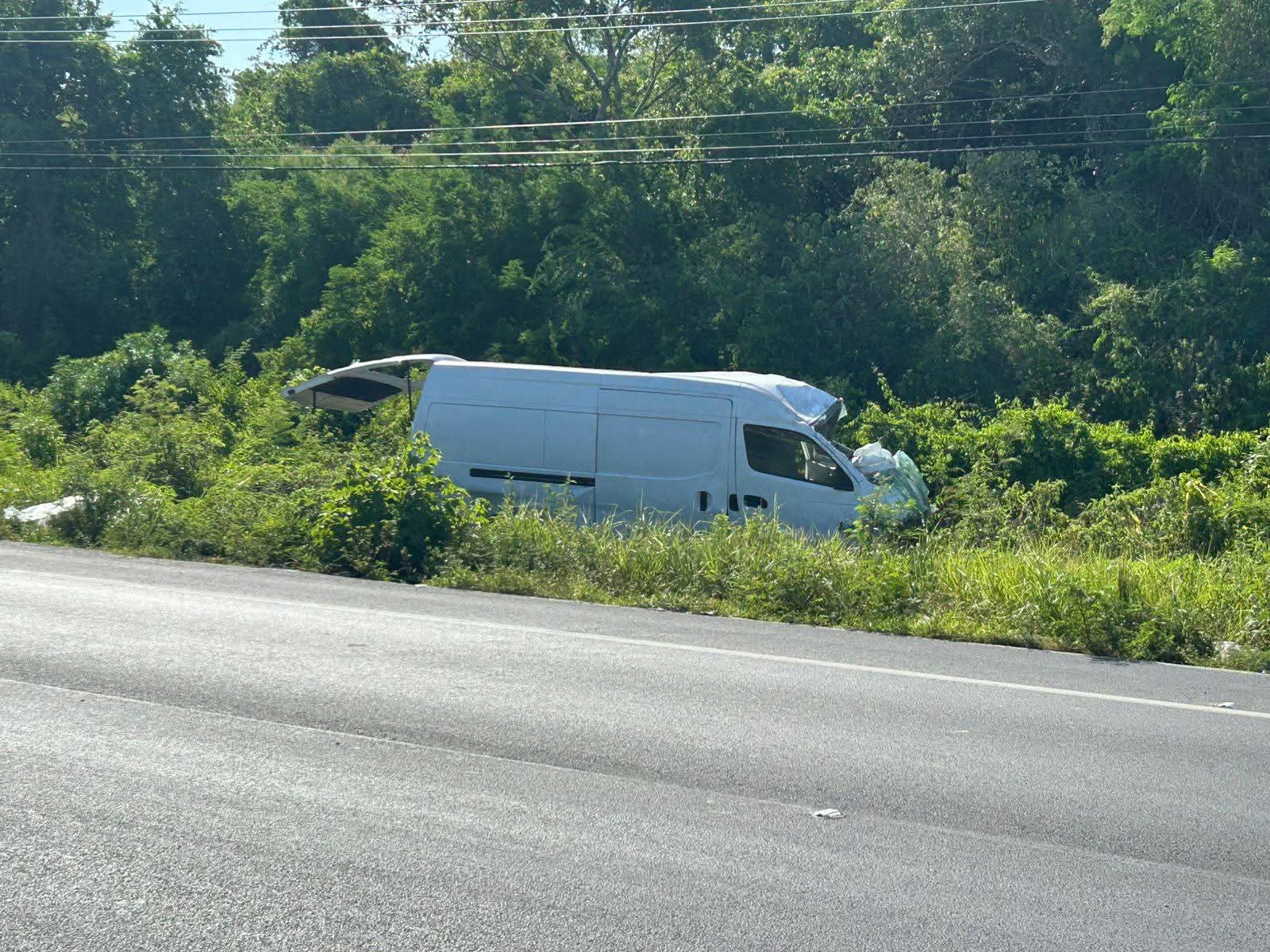 Playa del Carmen, a 08 de agosto de 2025.- El conductor de una camioneta blanca de paquetería (placas UTN-856-K) aparentemente perdió el control en la curva de Punta Maroma, saliéndose de la carretera y volcando la unidad, del impacto el ocupante falleció por los golpes ya que de manera preliminar no traía puesto el cinturón de seguridad.