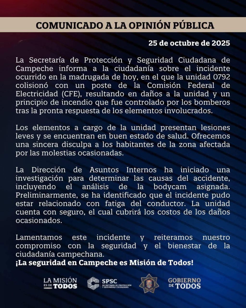 San Francisco de Campeche, Cam., 25 de octubre.- La Unidad de Asuntos Internos de la Secretaría de Protección y Seguridad Ciudadana (SPSC), se encargará de investigar el accidente de la patrulla 0792, misma que chocó contra un poste de concreto y terminó incendiándose.