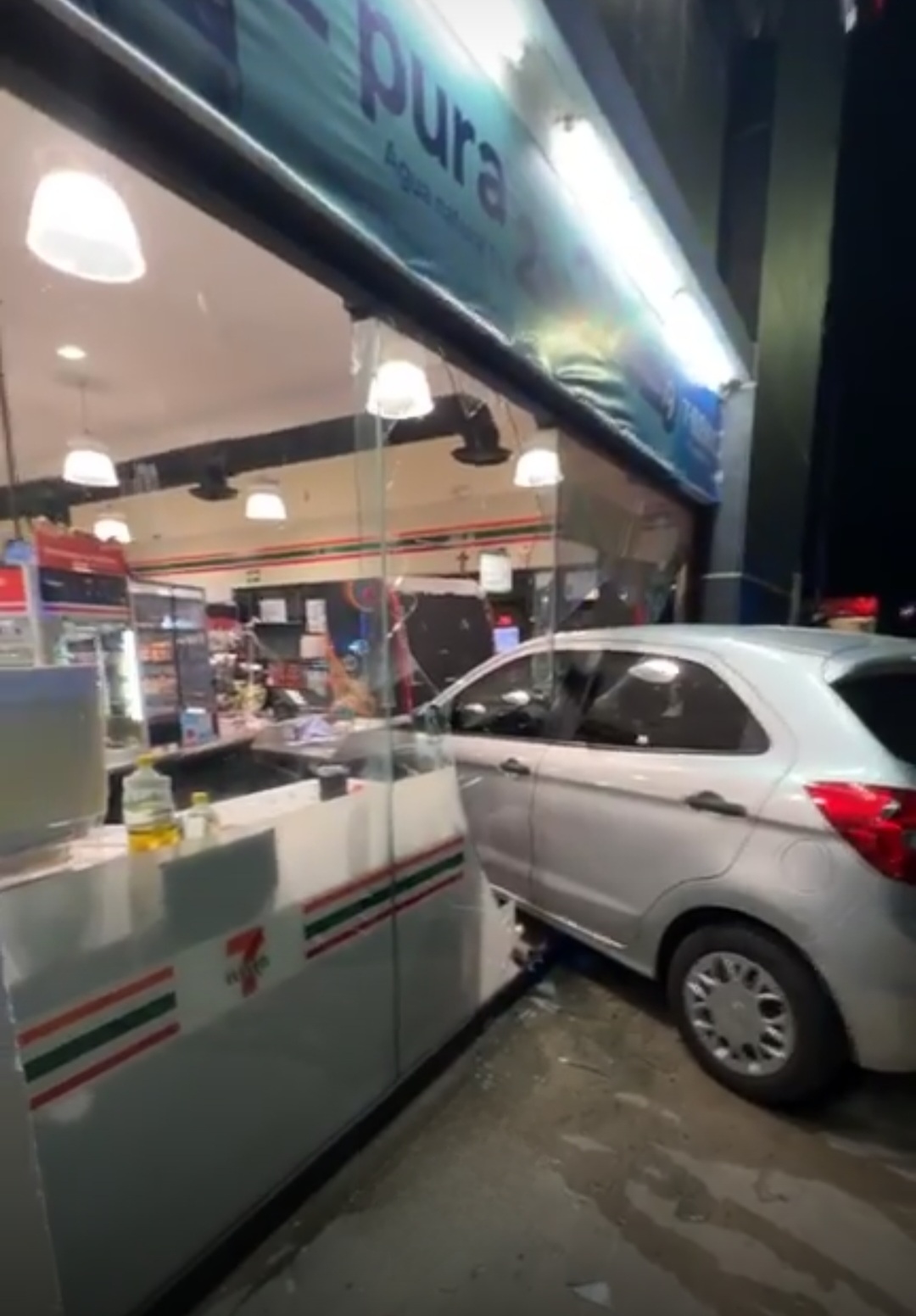 Playa del Carmen, a 05 de agosto de 2025.- Una inexperta conductora tomó el vehículo Ford, tipo Figo, color gris, propiedad de su compañero de cuarto, para ir de compras a la tienda de conveniencia Seven Eleven, ubicada en la avenida 28 de Julio, fraccionamiento Cataluña II, pero su inexperiencia terminó estrellándolo en el cristal lateral del establecimiento, entrando hasta el área de cajas.