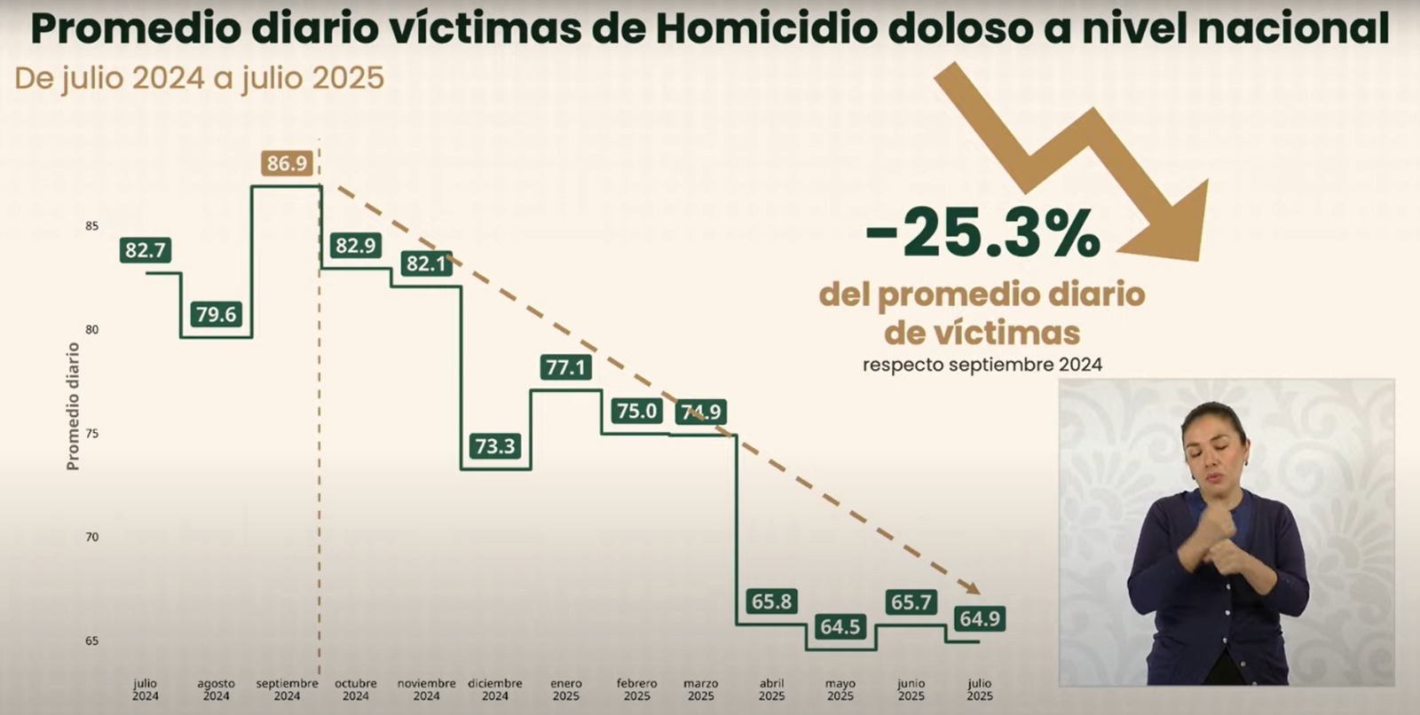El Gobierno de México mantiene un sólido compromiso con cada familia mexicana muestra de ello es julio de 2025 que se convirtió en el mes con el menor número de homicidios registrados en los últimos 10 años en comparación con el mismo mes desde 2015, bajo el liderazgo de la presidenta Claudia Sheinbaum hemos logrado una reducción del 25% en los homicidios respecto a septiembre de 2024, se trata de un mito histórico para este indicador con 22 homicidios menos por día, esto ha sido posible gracias a los cuatro ejes que integran la Estrategia Nacional de Seguridad del Gobierno de México.