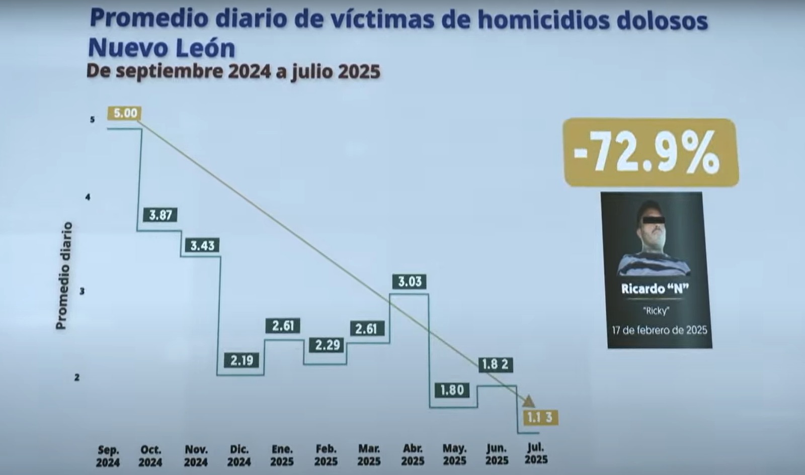 En Nuevo León con la detención de varios generadores de violencia en la entidad y el aseguramiento en febrero de Ricardo “N” alias el “Ricky” identificado como el segundo al mando del cartel del noreste, permitió reducir los homicidios en un 72.9% en julio de 2025 respecto a septiembre de 2024.