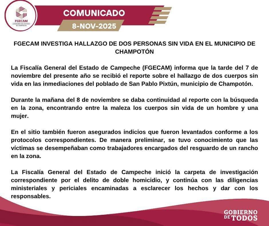 San Francisco de Campeche, Cam., 8 de noviembre.- La Fiscalía General del Estado de Campeche (FGECAM) informa que la tarde del 7 de noviembre del presente año se recibió el reporte sobre el hallazgo de dos cuerpos sin vida en las inmediaciones del poblado de San Pablo Pixtún, municipio de Champotón.