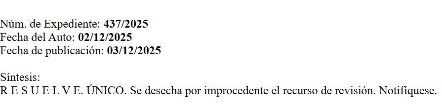 Esta sentencia fue formalizada ayer martes 2 de diciembre y notificada este miércoles 3 en los estrados, con la escueta anotación: “Resuelve. Único. Se desecha por improcedente el recurso de revisión. Notifíquese”.