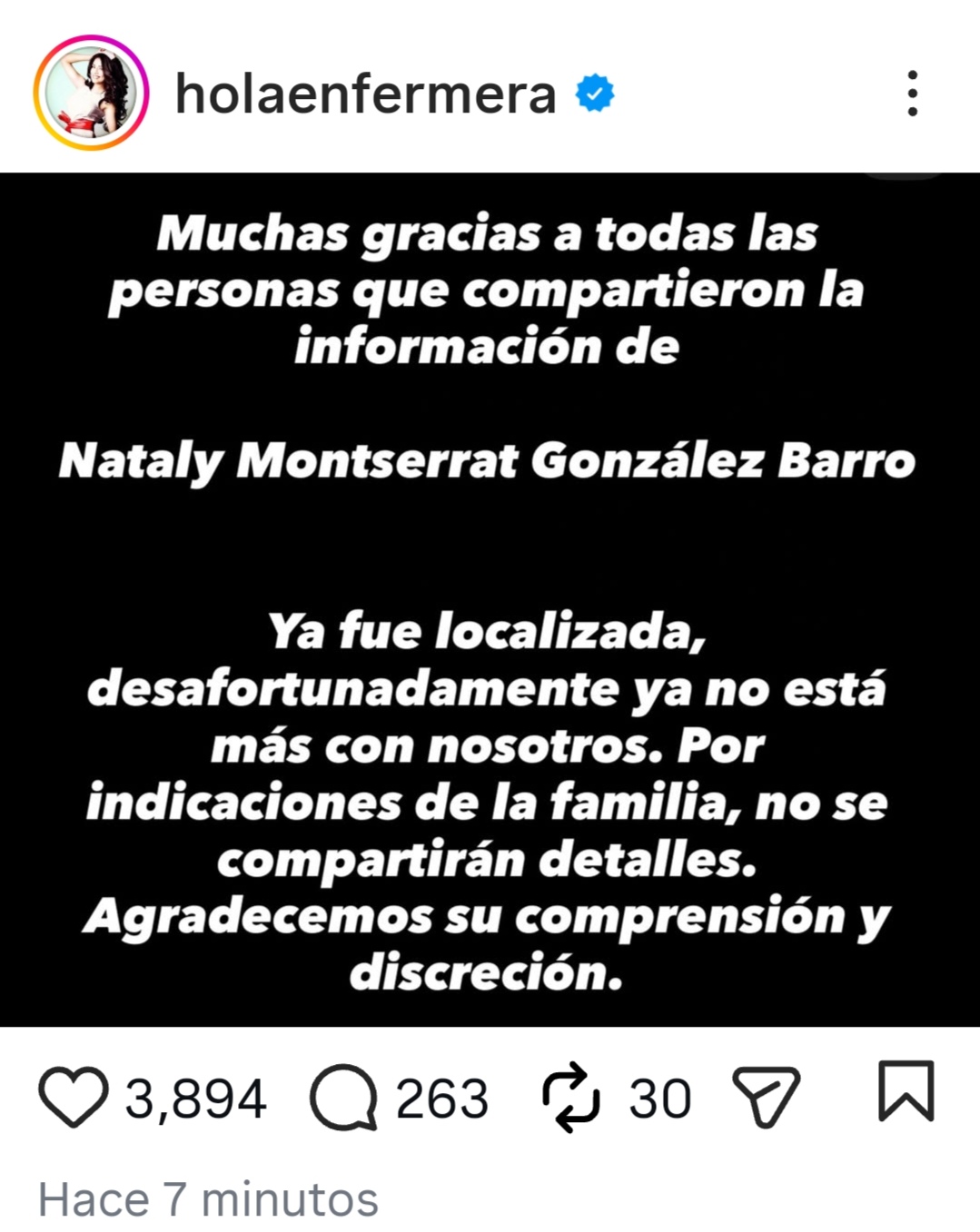 “Muchas gracias a todas las personas que compartieron la información de Nataly Montserrat González Barro. Ya fue localizada, desafortunadamente ya no está más con nosotros. Por indicaciones de la familia, no se compartirán detalles. Agradecemos su comprensión y discreción”.
