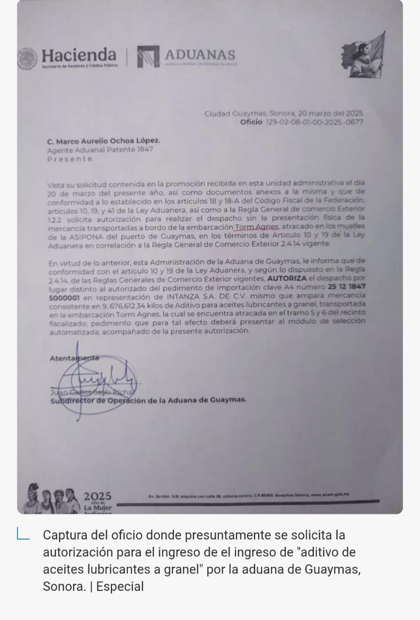 En el caso de Intanza, también estaría detrás de la importación ilegal de diésel que llegó en marzo pasado en el buque “Torm Agnes” al puerto de Guaymas, Sonora, luego de que las autoridades ya habían realizado operativos en la aduana de Tampico.