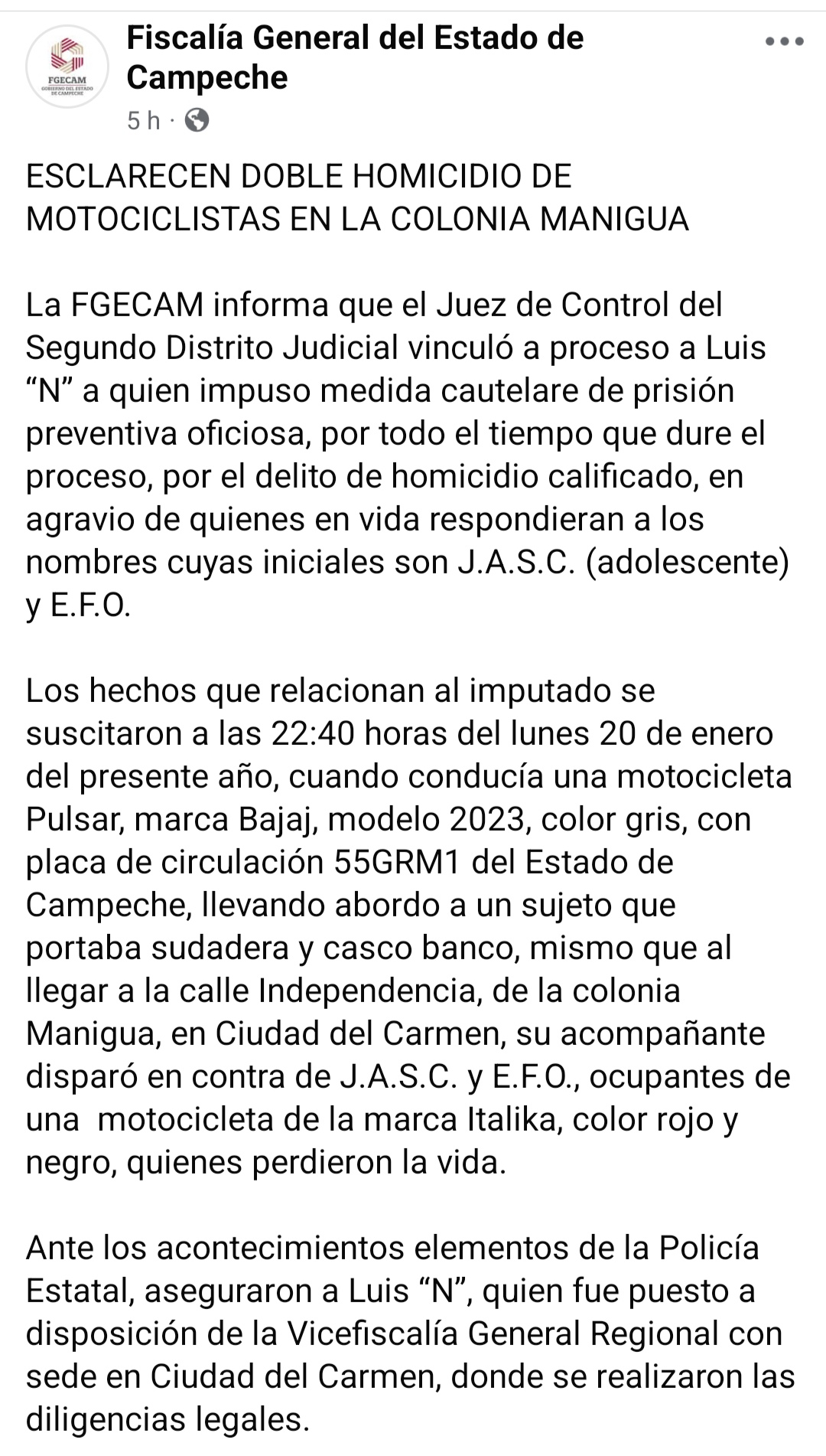 San Francisco de Campeche, Cam., 31 de enero.- La Fiscalía General del Estado de Campeche (FGECAM) confirmó la vinculación a proceso contra Luis “N”, detenido por la doble ejecución de “motomandaditos”, uno de ellos adolescente, en la colonia Manigua de Ciudad del Carmen, del municipio del Carmen, Campeche.