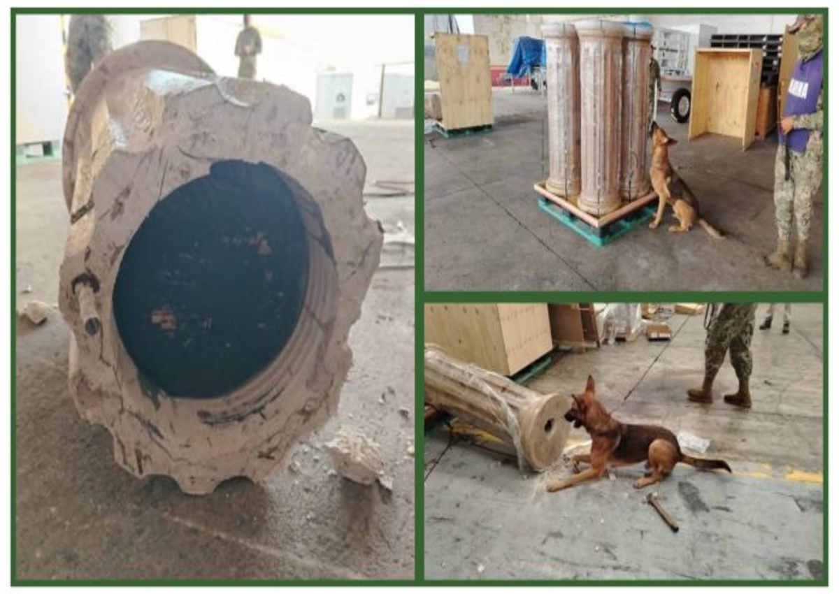 La institución destacó que el aseguramiento de la presunta droga se logró dentro de la Cesionaria de Corporación Integral de Comercio Exterior (CICE) tras una revisión, con apoyo de perros detectores de enervantes, que de inmediato al inspeccionar varias columnas de piedra de cantera comenzaron a ladrar, como señal de que en varias columnas se encontraban sustancias ilícitas.