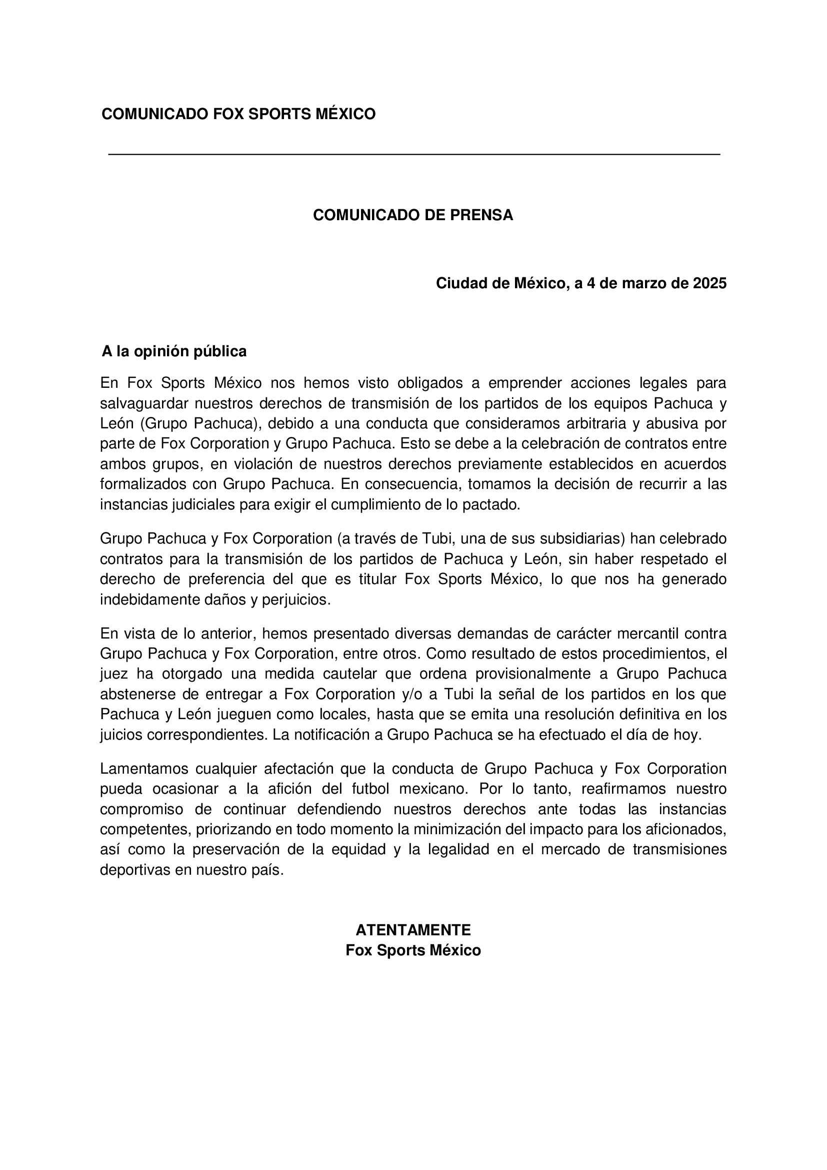 En Fox Sports México nos hemos visto obligados a emprender acciones legales para salvaguardar nuestros derechos de transmisión de los partidos de los equipos Pachuca y León (Grupo Pachuca), debido a una conducta que consideramos arbitraria y abusiva por parte de Fox Corporation y Grupo Pachuca.