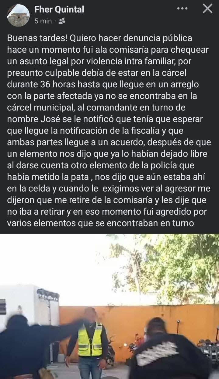 El domingo pasado, Fernando Quintal denunció en su perfil de Facebook que fue víctima de agresión por parte de elementos de la Policía Municipal al acudir a la comisaría para verificar la situación de su cuñado, Jonathan de Jesús Cen Uicab.