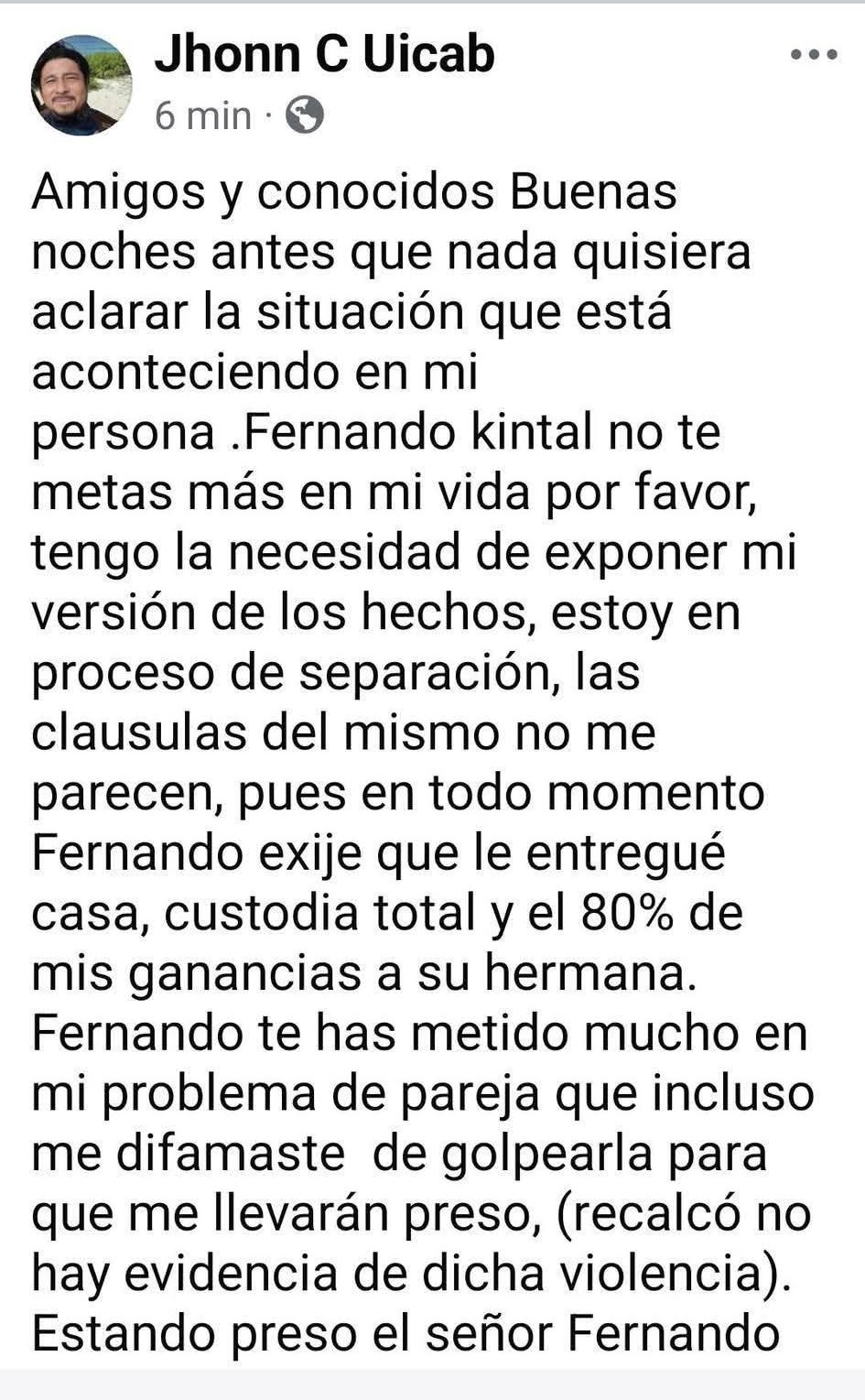 Por su parte, Jonathan Uicab también publicó su versión, negando las acusaciones de violencia intrafamiliar y acusando al regidor Quintal de difamarlo para presionarlo en un proceso de separación.