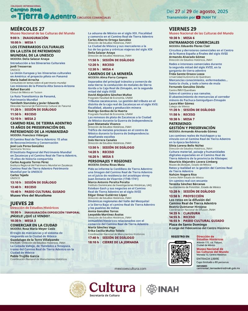 Posteriormente, a las 12:10 horas, se dictará la conferencia Camino Real de Tierra Adentro, 15 años de preservación del patrimonio de la humanidad, que abrirá con la participación del secretario técnico del INAH, José Luis Perea González.