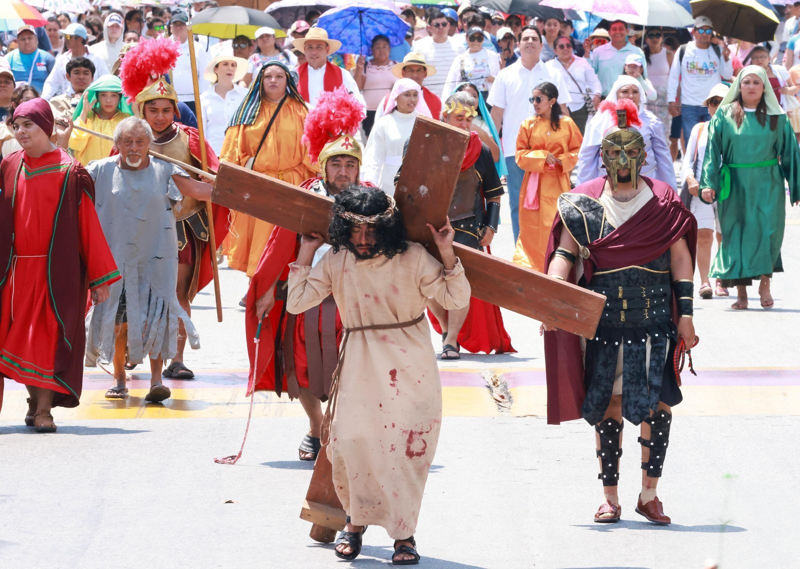 ISLA MUJERES, Q.ROO, 18 de abril-. Cerca de mil 200 personas, según los organizadores, entre locales y turistas, se sumaron a la representación del Vía Crucis Viviente en Isla Mujeres, que celebra este año su edición 32.