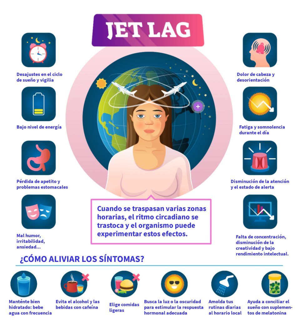 “El jet lag es el desfase horario, también conocido como trastorno por disritmia circadiana, es un problema temporal del sueño que puede afectar a cualquier persona que atraviese rápidamente varios husos horarios”