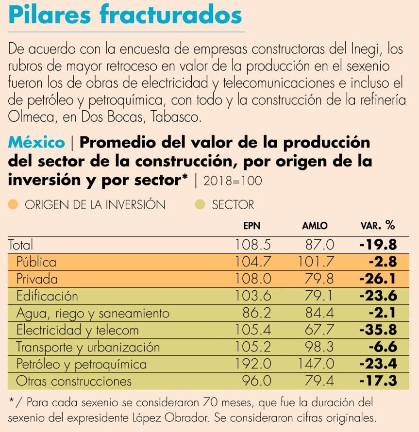 El dato surge al comparar el promedio de las lecturas mensuales del índice de actividad del sector de la construcción de los 70 meses que duró el sexenio de López Obrador (diciembre del 2018 a septiembre del 2024), respecto de la media mensual en el lapso comparable del gobierno del expresidente Enrique Peña Nieto. Este descenso contrastó con los incrementos sexenales del 5.4%, el 20% y el 8.1% de los gobiernos federales del citado Peña Nieto (2012-2018), Felipe Calderón Hinojosa (2006-2012) y Vicente Fox Quezada (2000-2006), respectivamente.