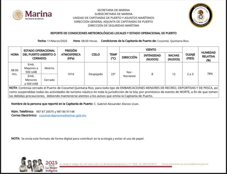 COZUMEL, Q. ROO, 11 de marzo.- Se mantiene cerrado el puerto para embarcaciones de menos de 15 metros de eslora y la realización de actividades acuáticas recreativas y de pesca en toda la jurisdicción de Cozumel, donde se registra un descenso en las temperaturas y aunque no se esperan lluvias se recomienda mantenerse atentos a las condiciones climáticas.