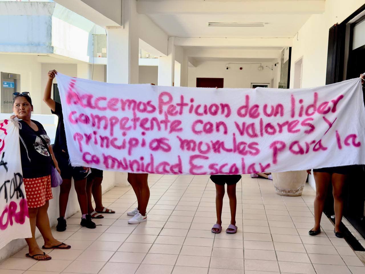 En el plantón gritaban en voz coreada como presidenta, así como te escuchamos en tu campaña electoral, ahora queremos que nos escuches, porque queremos que nuestros hijos no pierdan clases, venimos en son de paz, exigiendo a un nuevo director porque no queremos al maestro Candelario García, acusado de abusos laborales y sexuales.