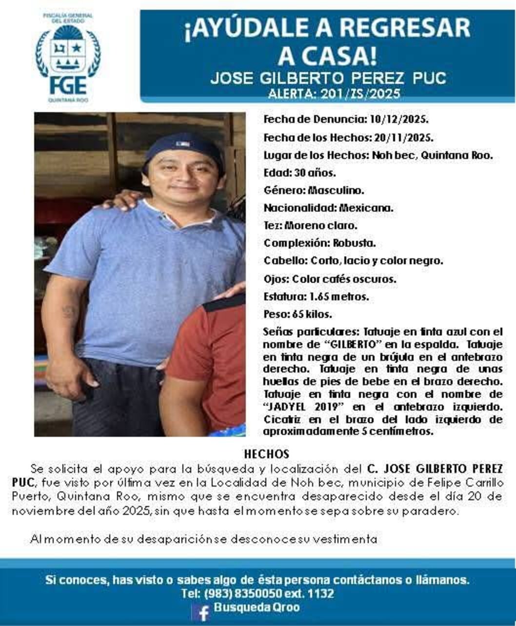 FELIPE CARRILLO PUERTO a 11 de diciembre. — En medio del clima de inseguridad que persiste en la región, la Fiscalía General del Estado de Quintana Roo activó una ficha de búsqueda para localizar a José Gilberto Pérez Puc, de 30 años, desaparecido desde el pasado 20 de noviembre de 2025 en la comunidad de Noh Bec, municipio de Felipe Carrillo Puerto.