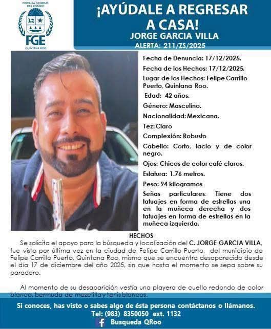 FELIPE CARRILLO PUERTO a 18 de diciembre.— La percepción de inseguridad que se ha extendido en este municipio volvió a crecer luego de que la Fiscalía General del Estado emitiera una alerta de búsqueda por la desaparición de Jorge García Villa, de 42 años, quien fue visto por última vez el 17 de diciembre en la cabecera municipal.