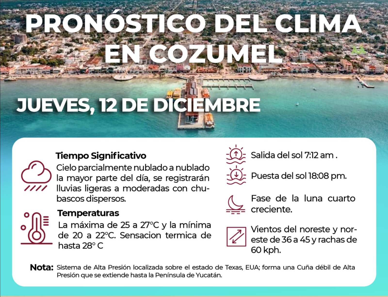 Tiempo Significativo: se estima Cielo nublado la mayor parte del día, se registrarán lluvias ligeras a moderadas con chubascos dispersos que no serán importantes, vientos del norte y noreste de 36 a 45 y rachas de 60 kph disminuyendo por la tarde noche a 27 y 36 kph, oleaje de 7 a 11 pies en el canal de Yucatán. Las temperaturas la máxima de 25 a 27°C y la mínima para mañana de 20 a 22°C poco frías por la mañana y noche, templadas el resto del día, temperatura del Mar de 23 a 25°C. La sensación térmica de 28°C entre las 14 y 16 horas.