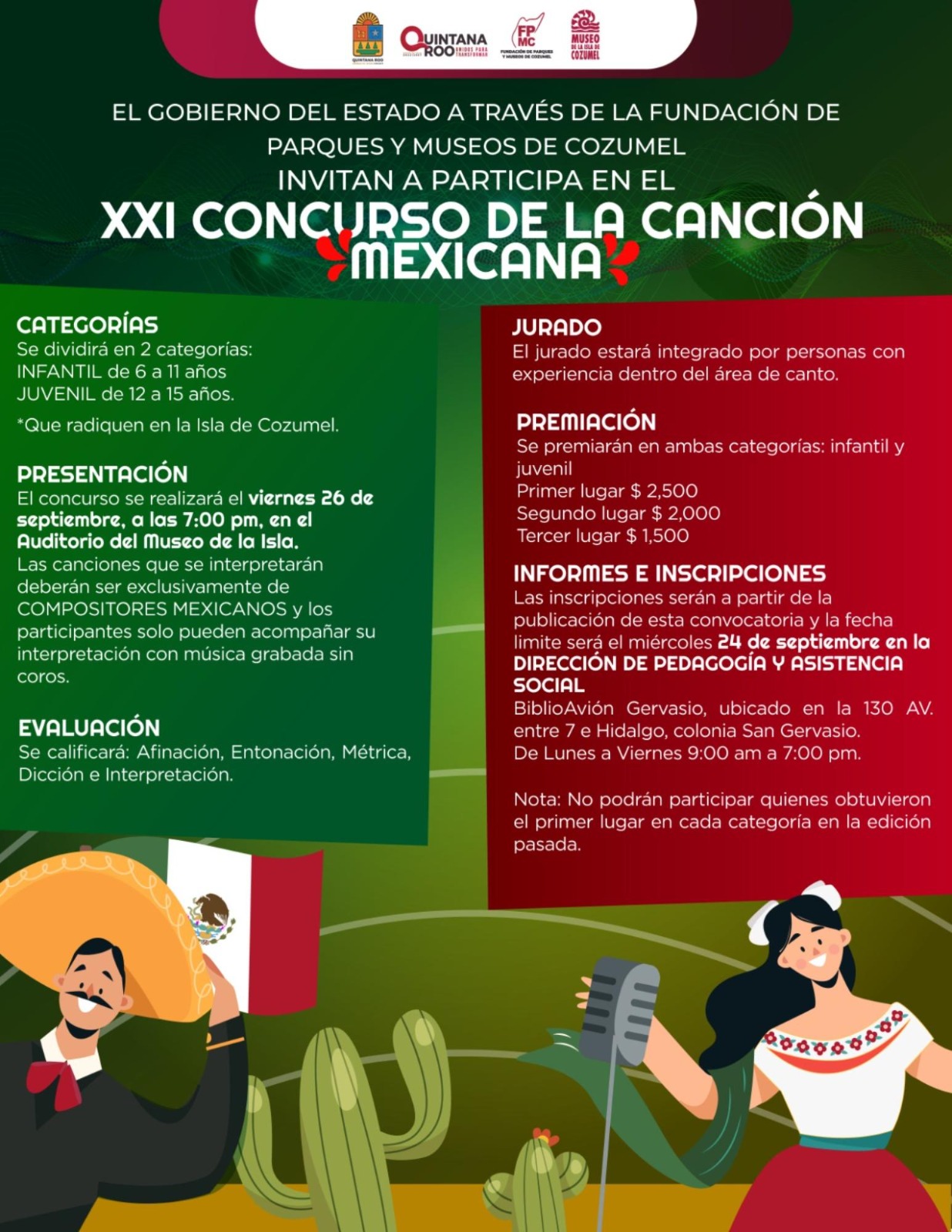 Cozumel.– Con motivo de las celebraciones patrias y con el propósito de abrir espacios de expresión artística para las nuevas generaciones, la Fundación de Parques y Museos de Cozumel (FPMC) invita a niñas, niños y jóvenes a participar en el XXI Concurso de la Canción Mexicana, que se realizará el próximo 26 de septiembre, en el auditorio del Museo de la Isla.