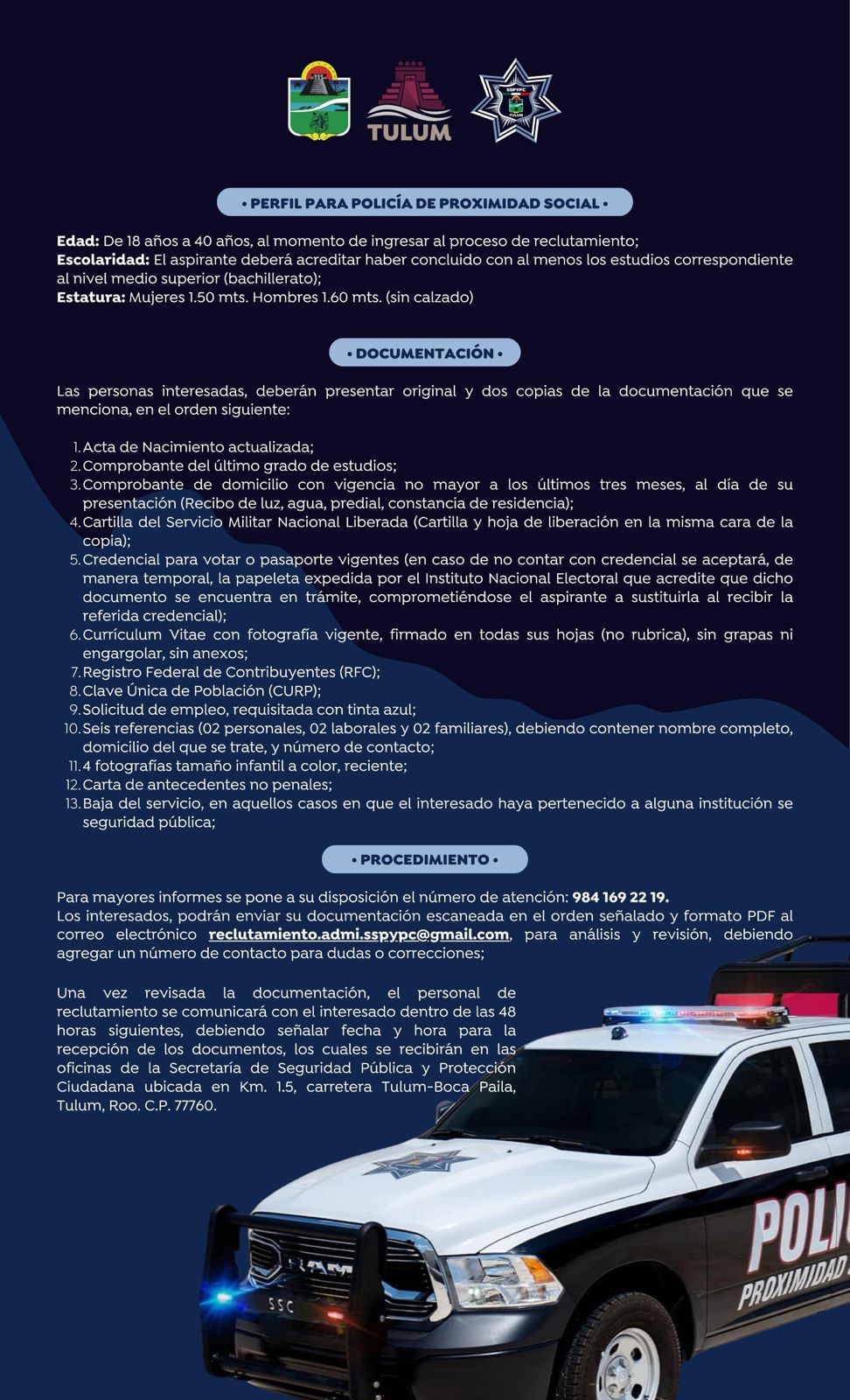 TULUM a 05 de agosto .— La Secretaría de Seguridad Pública y Protección Ciudadana (SSPyPC) del municipio de Tulum emitió una convocatoria oficial dirigida a exintegrantes de corporaciones policiales que causaron baja voluntaria y desean reincorporarse al servicio activo. El objetivo es reforzar el cuerpo de Policía de Proximidad Social, como parte de las estrategias para fortalecer la seguridad en el municipio.