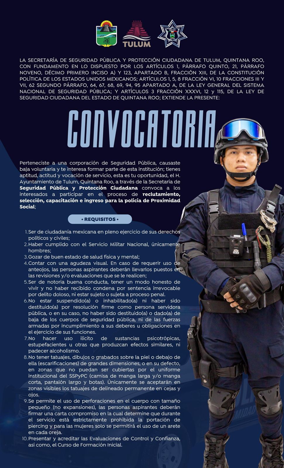TULUM a 05 de agosto .— La Secretaría de Seguridad Pública y Protección Ciudadana (SSPyPC) del municipio de Tulum emitió una convocatoria oficial dirigida a exintegrantes de corporaciones policiales que causaron baja voluntaria y desean reincorporarse al servicio activo. El objetivo es reforzar el cuerpo de Policía de Proximidad Social, como parte de las estrategias para fortalecer la seguridad en el municipio.