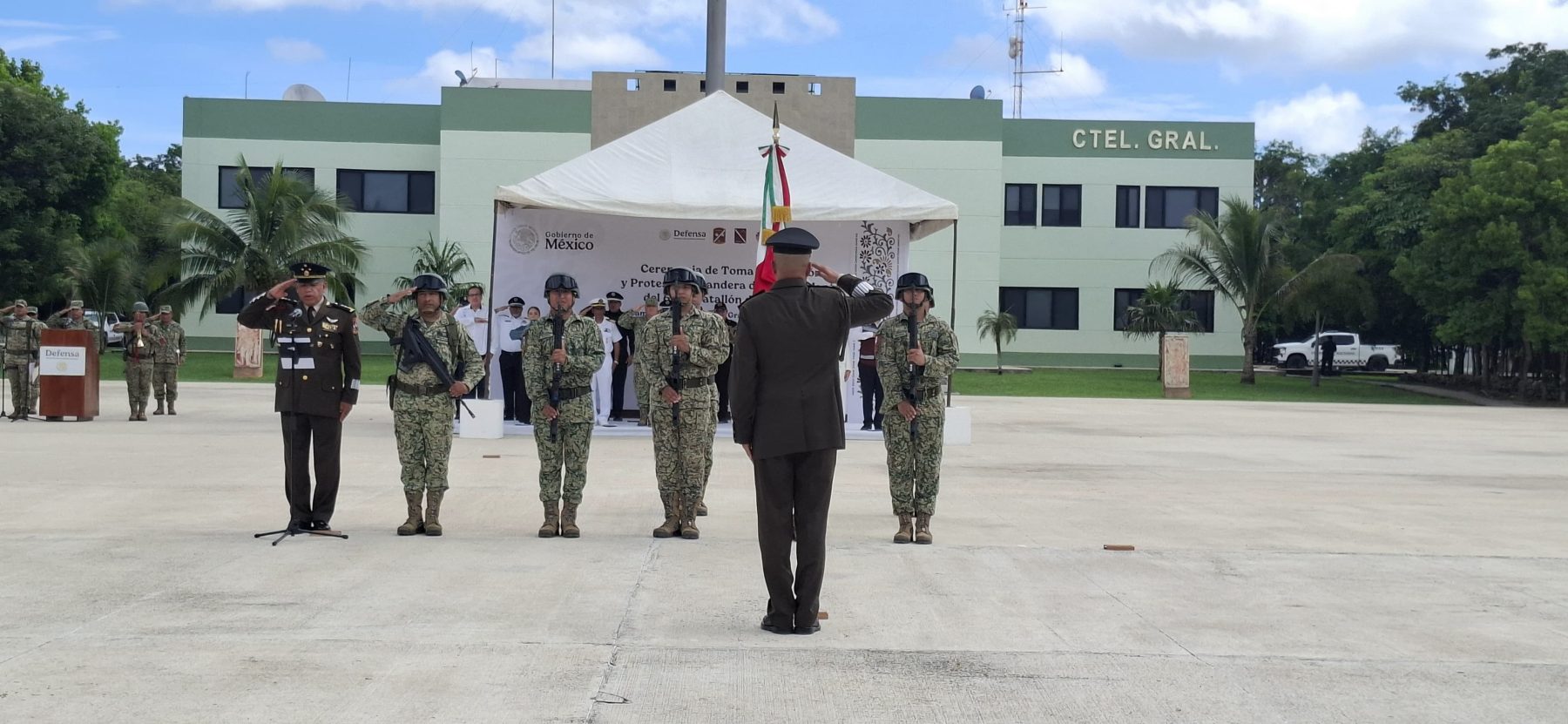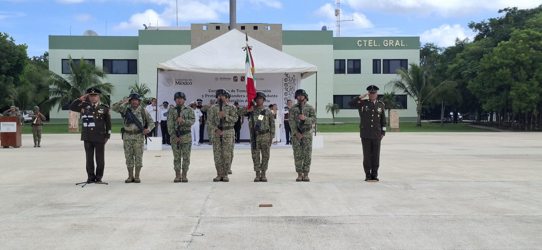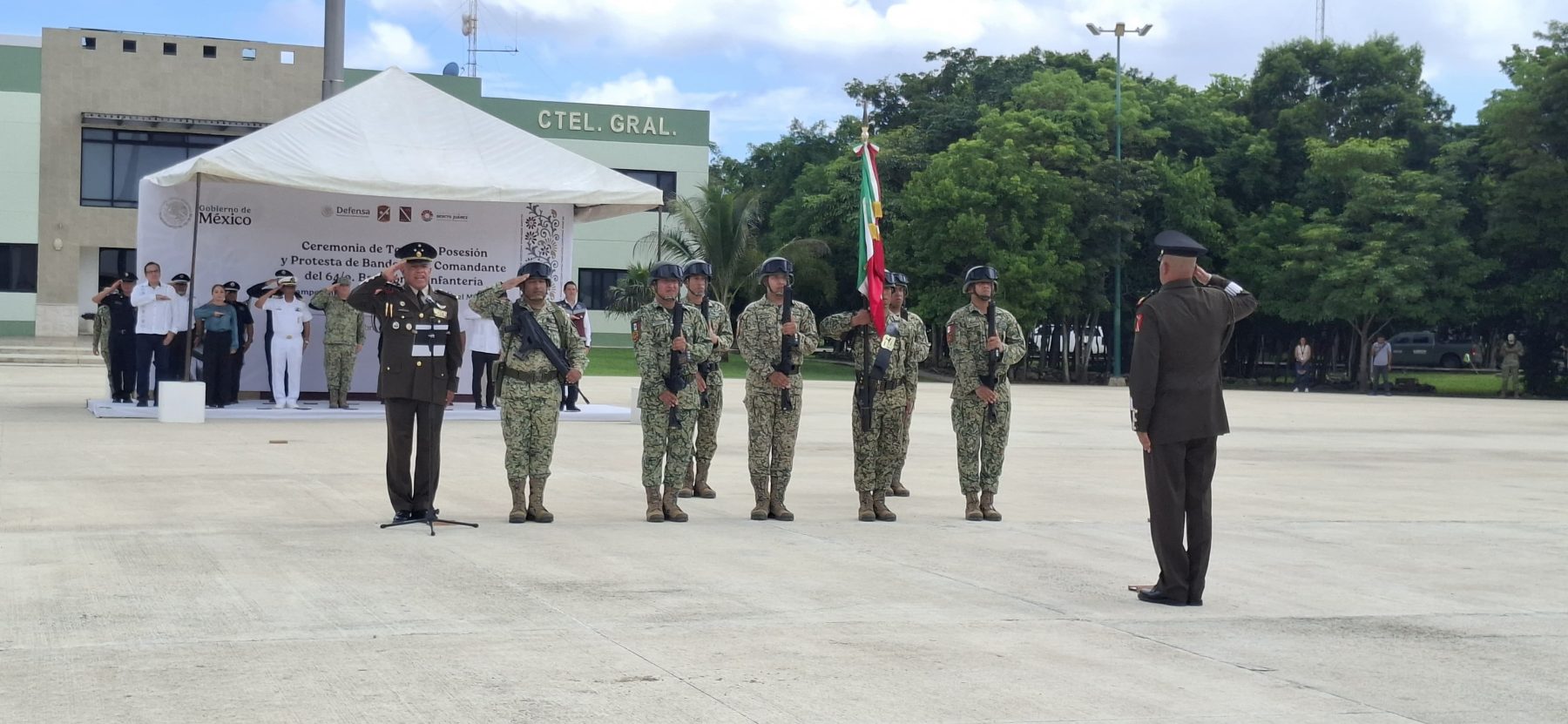 Cancún, 3 de octubre.- Hoy al mediodía se llevó a cabo la ceremonia oficial de toma de protesta del nuevo comandante del 64/o. Batallón de Infantería. El coronel de Infantería de Estado Mayor Guillermo Robles Tozcano asumió formalmente el cargo en las instalaciones de Ciudad Militar.