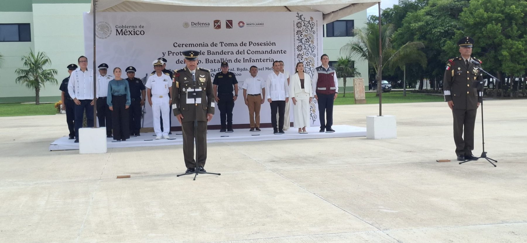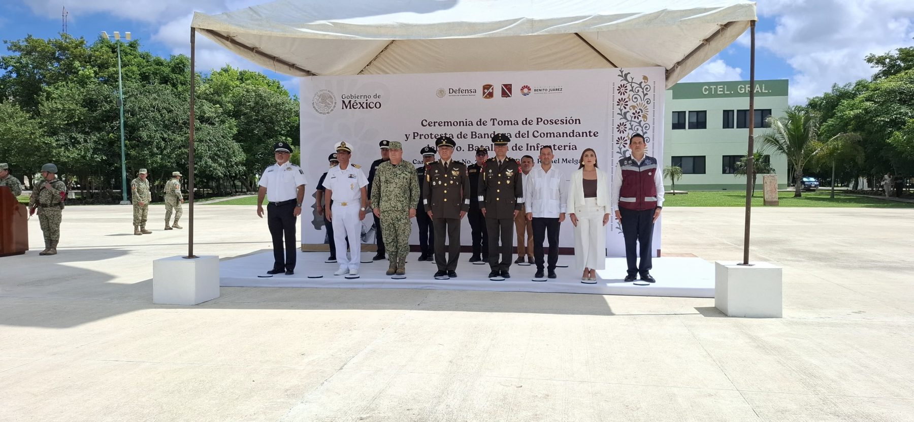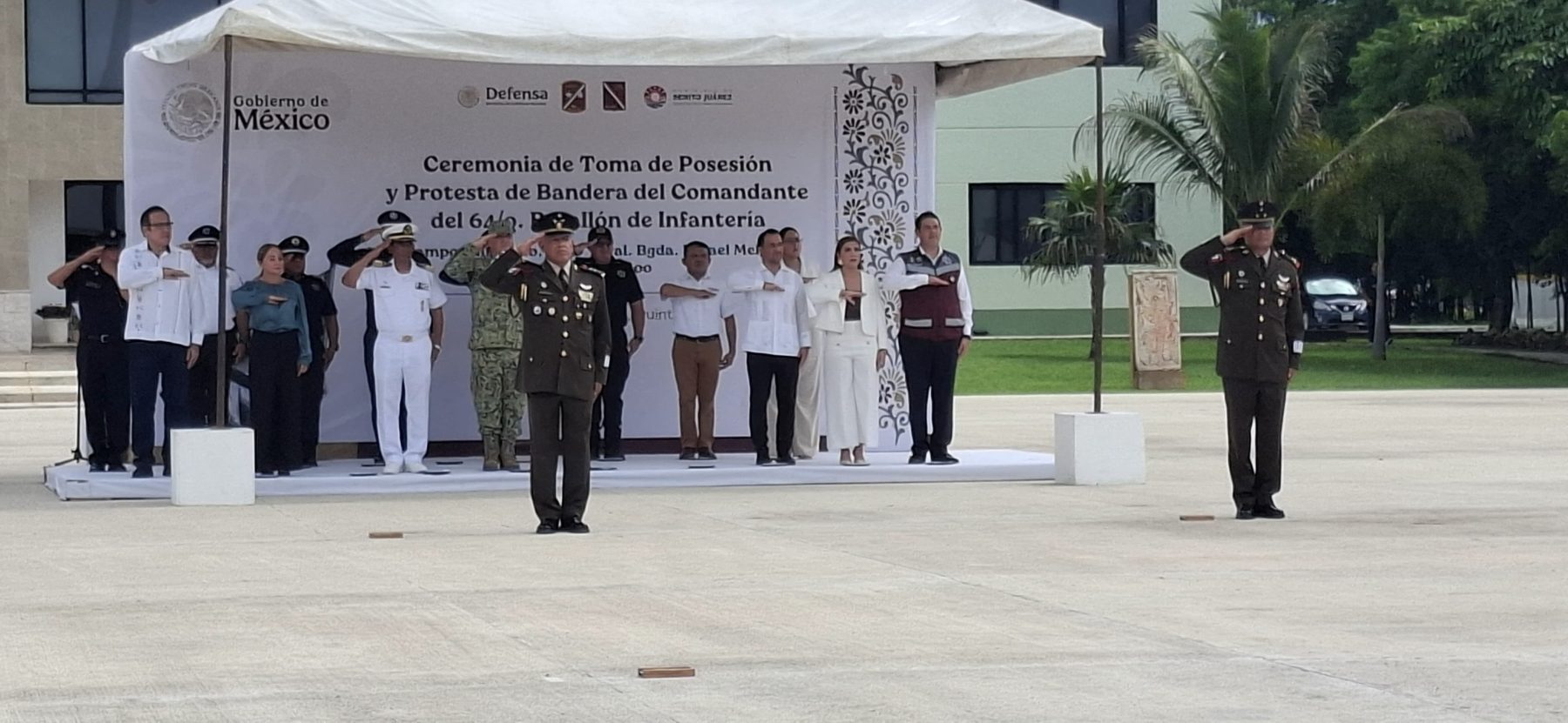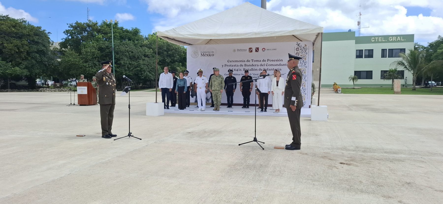 Cancún, 3 de octubre.- Hoy al mediodía se llevó a cabo la ceremonia oficial de toma de protesta del nuevo comandante del 64/o. Batallón de Infantería. El coronel de Infantería de Estado Mayor Guillermo Robles Tozcano asumió formalmente el cargo en las instalaciones de Ciudad Militar.