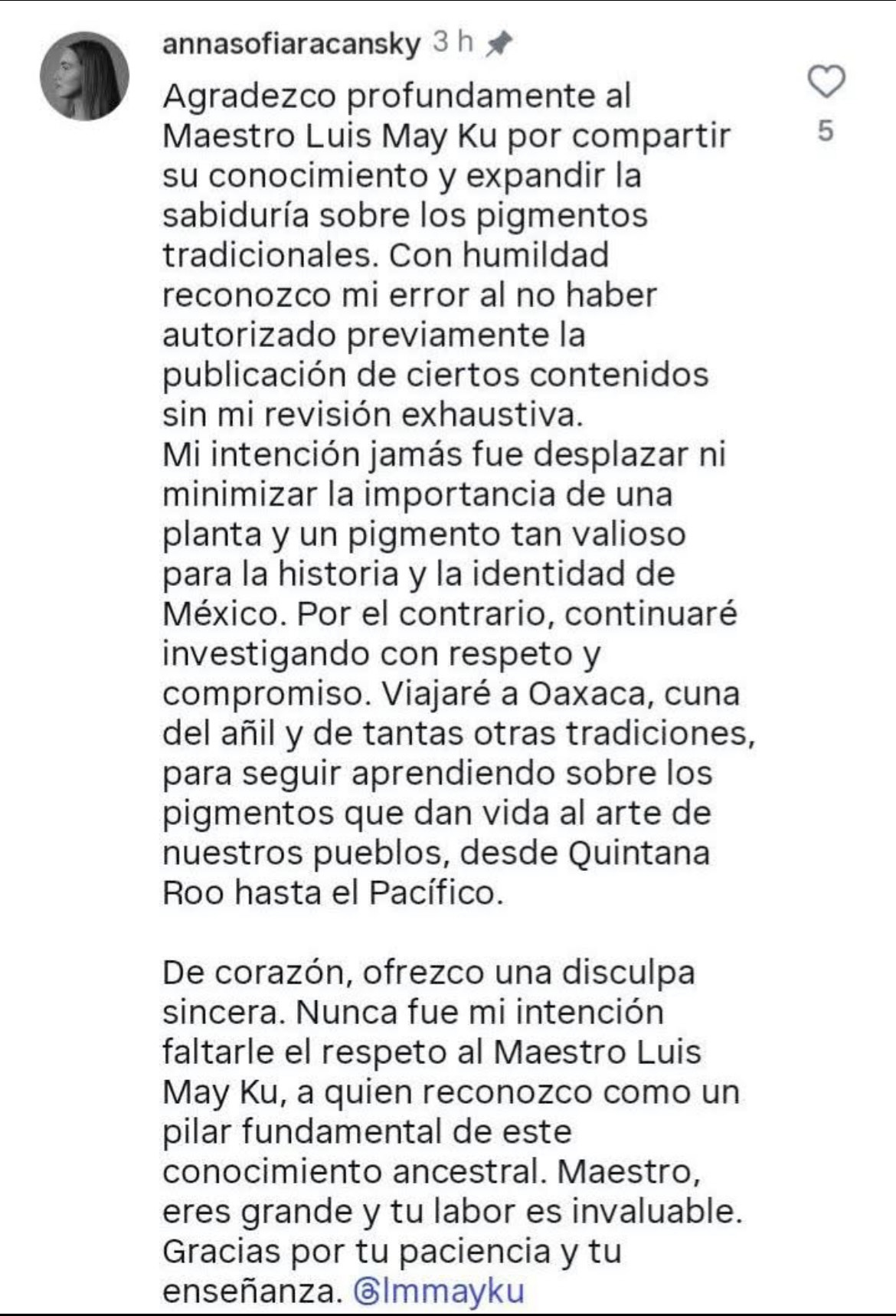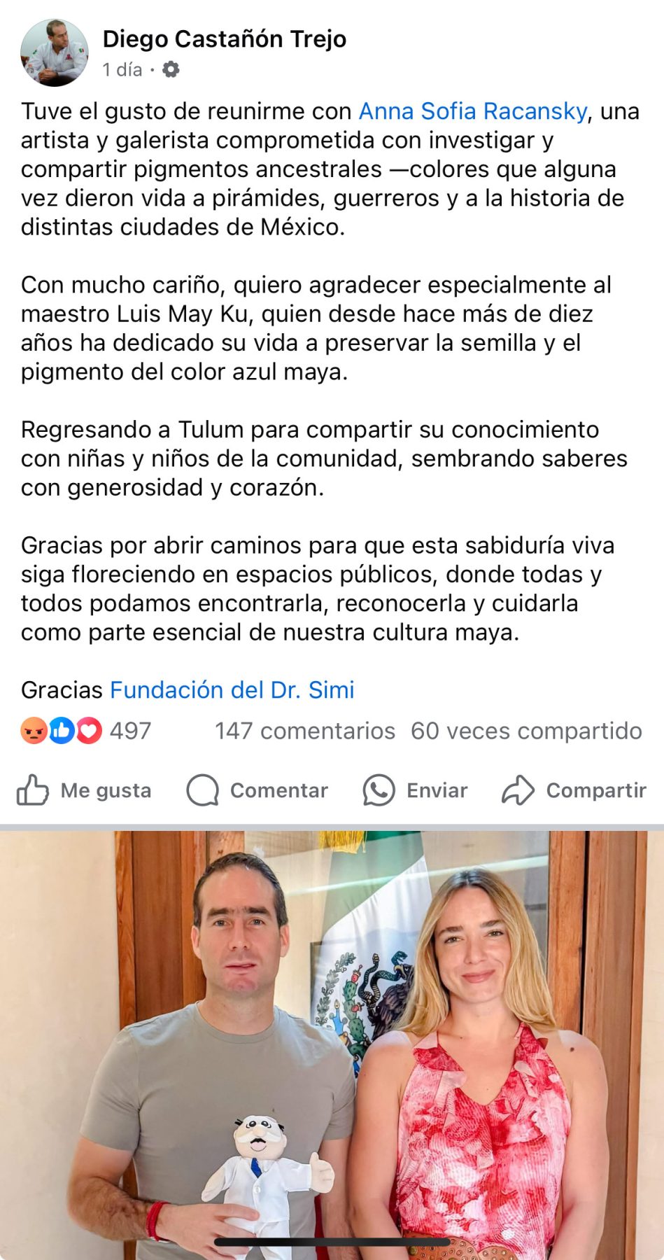 Lo anterior, luego que el maestro Luis May, calificó como una “Indignación y falta de respeto” el hecho de que el gobierno de Tulum y la fundación del Dr. Simi le dieron crédito a Anna Sofía Racanski, tras haber tomado solo un par de clases del maestro Luis May.
