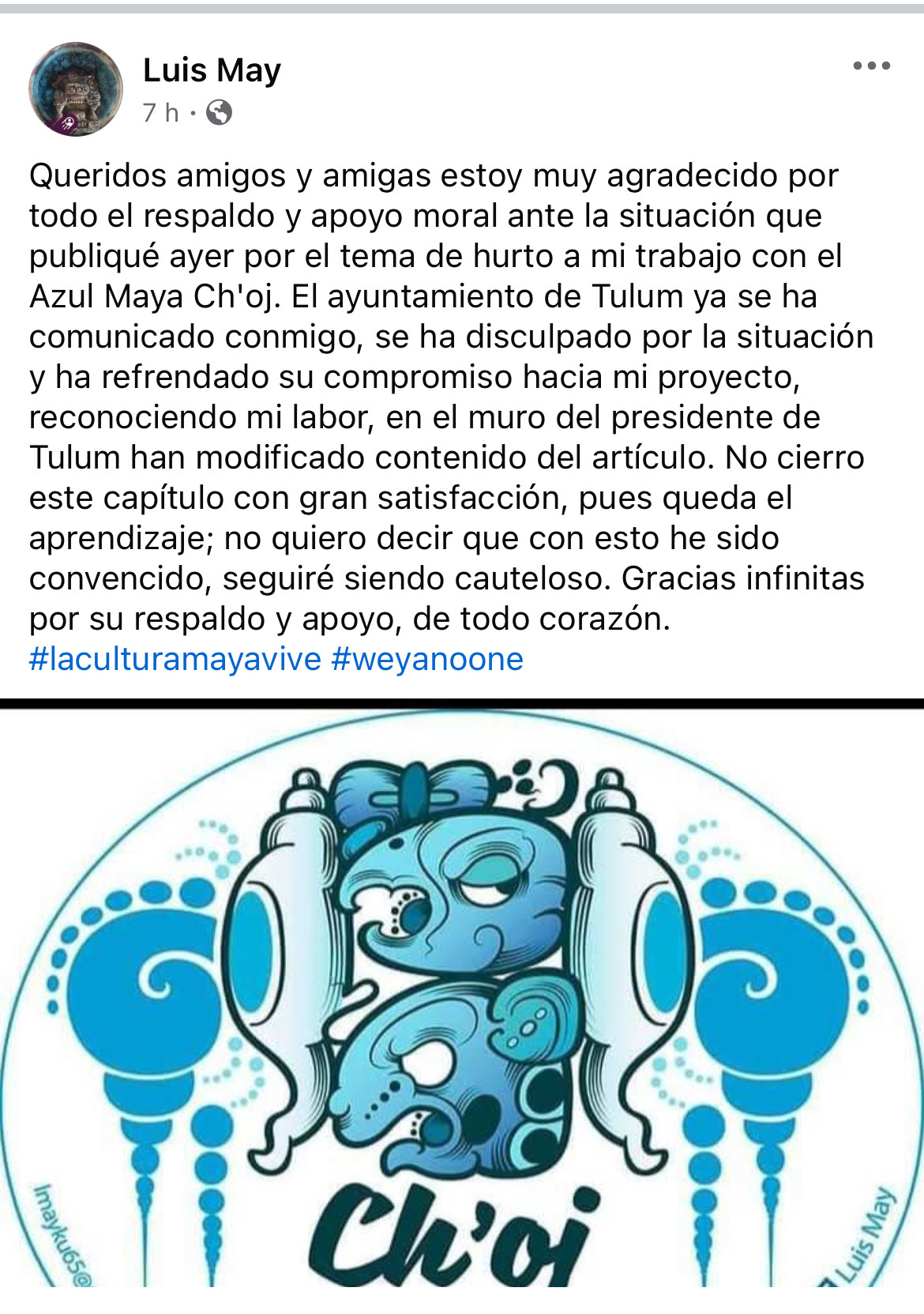 “Queridos amigos y amigas estoy muy agradecido por todo el respaldo y apoyo moral ante la situación que publiqué ayer por el tema de hurto a mi trabajo con el Azul Maya Ch’oj. El ayuntamiento de Tulum ya se ha comunicado conmigo, se ha disculpado por la situación y ha refrendado su compromiso hacia mi proyecto, reconociendo mi labor, en el muro del presidente de Tulum han modificado contenido del artículo. No cierro este capítulo con gran satisfacción, pues queda el aprendizaje; no quiero decir que con esto he sido convencido, seguiré siendo cauteloso. Gracias infinitas por su respaldo y apoyo, de todo corazón”. Posteo el maestro.