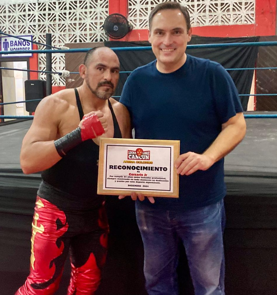 Por todo esto y más, la promotora Lucha Libre Cancún (LLC), que dirige Amador Gutiérrez Guigui, en coordinación con el comisionado Armando “Taurus” Góngora, junto a sus compañeros luchadores, le hicieron entrega de un reconocimiento a Corsario Jr., por 25 años de un gran carrera dentro del -Deporte Espectáculo-, misma que por supuesto sigue vigente.