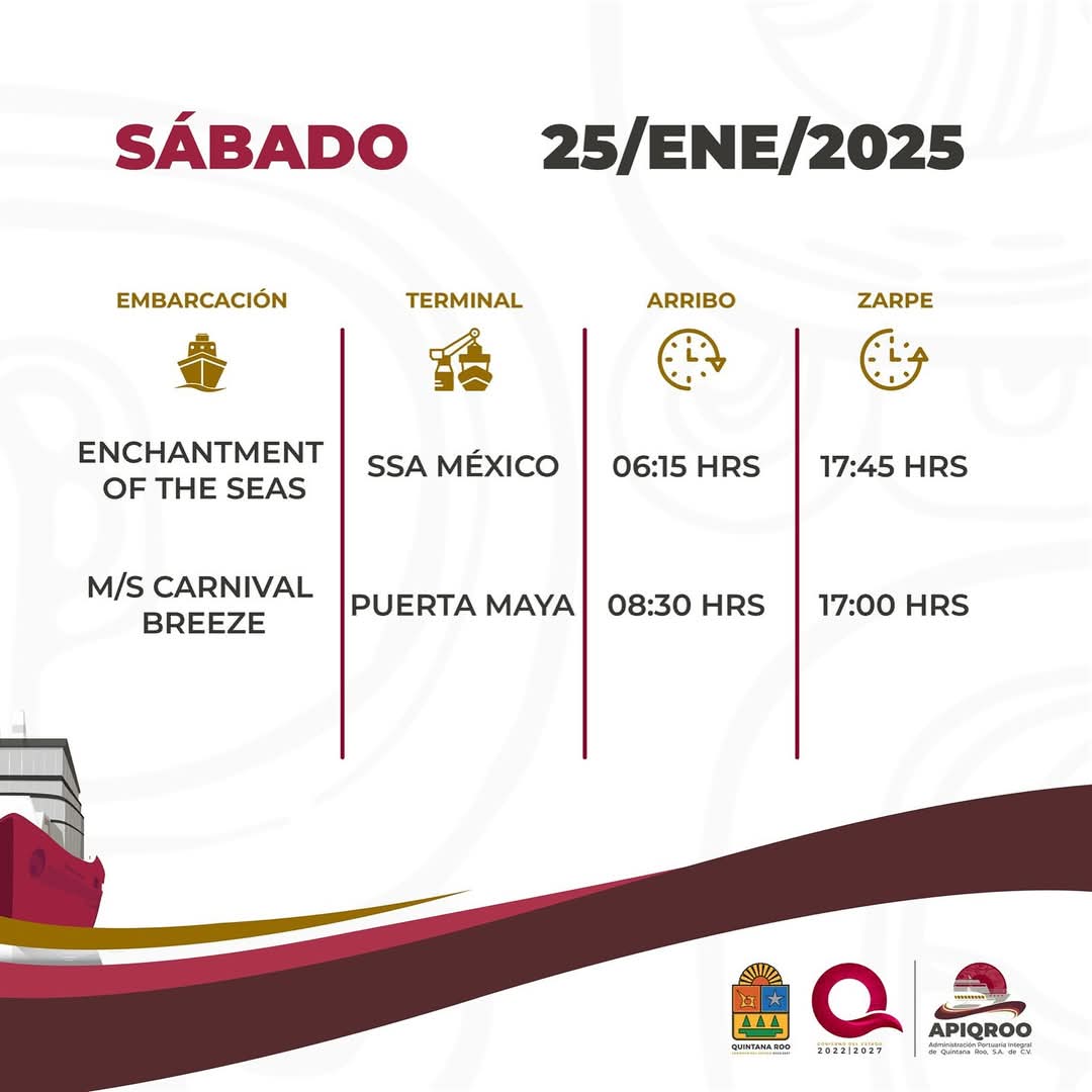 Este día la actividad portuaria de gran calado se limita a los muelles vecinos SSA México, que recibe de 06:15 a 17:45 al Enchantment of the Seas, así como Puerta Maya, donde ancló el Carnival Breeze de 08:30 a 17 horas, ya que el céntrico Punta Langosta no registra movimiento turístico.