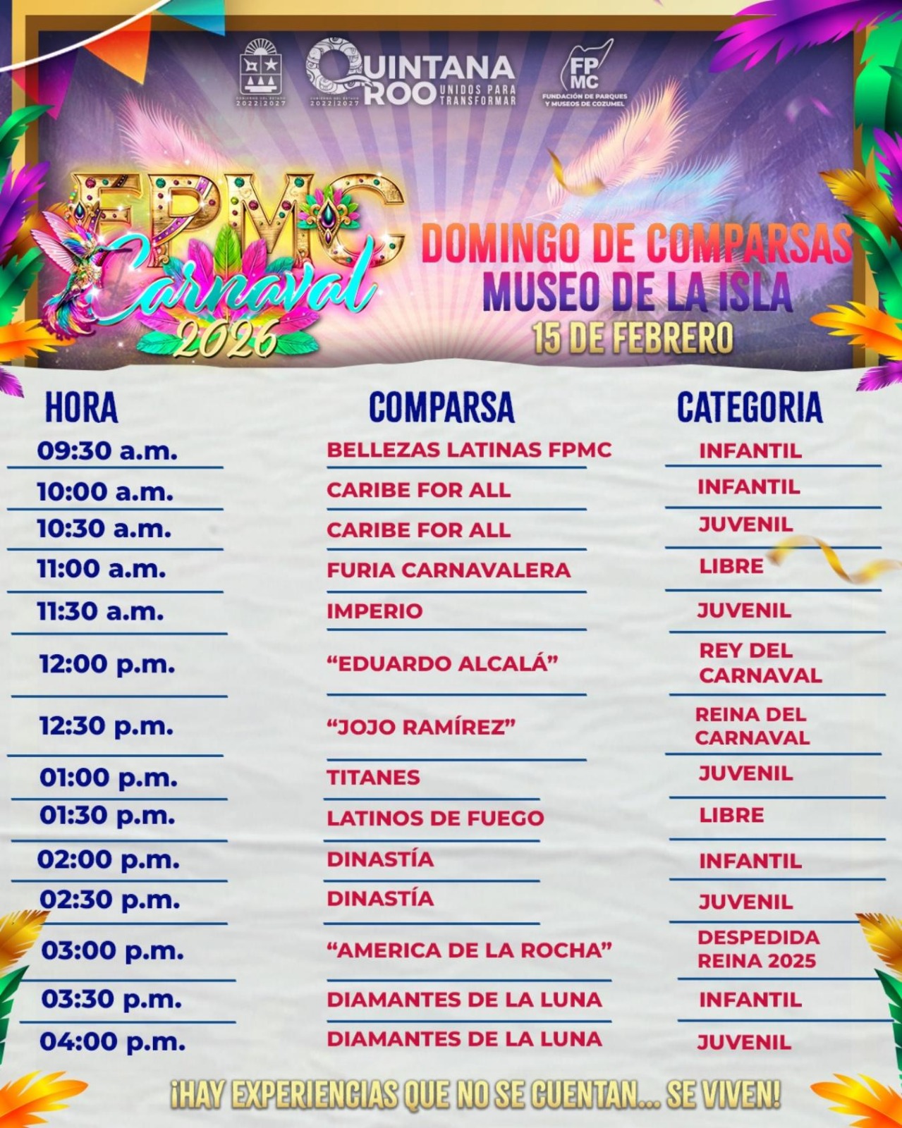 Cozumel.- La Fundación de Parques y Museos de Cozumel (FPMC) llevará a cabo la edición número 22 del tradicional “Domingo de Comparsas”, una de las actividades más emblemáticas y esperadas del Carnaval cozumeleño, que se realizará el domingo 15 de febrero, frente al Museo de la Isla, a partir de las 09:30 horas, con la participación de 14 comparsas que llenarán de ritmo, color y alegría el corazón de la ciudad.