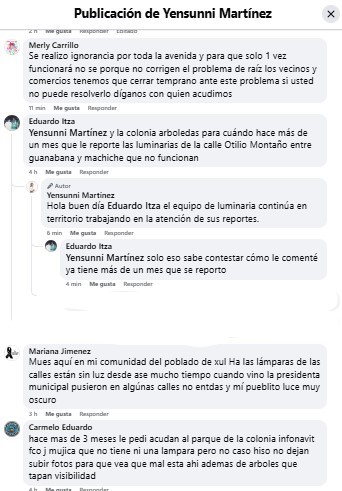 En una publicación oficial de la presidenta municipal, Yensunni Martínez, decenas de comentarios reflejan el creciente malestar por la falta de luminarias y el abandono del mantenimiento urbano.