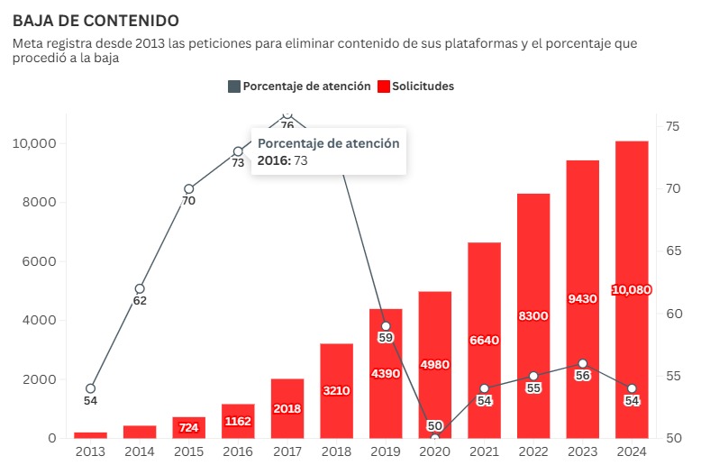 De acuerdo con los informes de Transparencia de la empresa Meta, entre 2019 y 2024 desde México se generaron 43 mil 820 solicitudes gubernamentales para eliminar contenido en sus diversas plataformas: Facebook, Instagram, WhatsApp, Messenger, Threads, Workplace y MetaQuest.