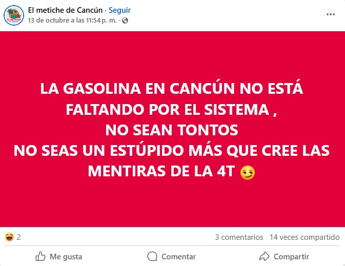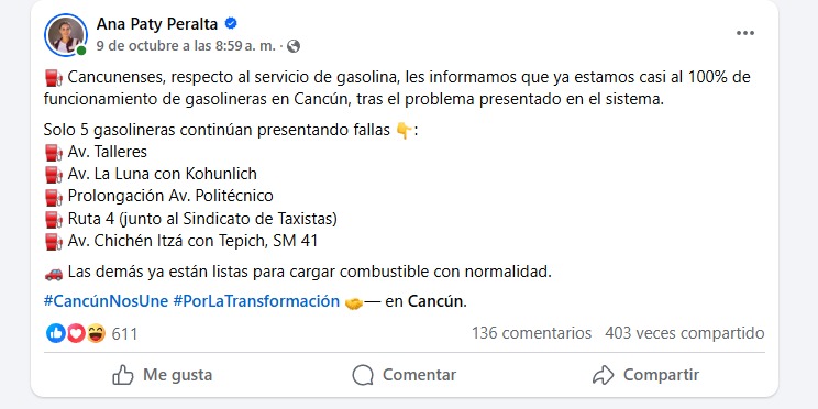 El pasado 9 de octubre, la presidenta municipal Ana Paty Peralta publicó que “solo cinco gasolineras continuaban con fallas” y que “todas las demás ya estaban listas para cargar combustible con normalidad.”