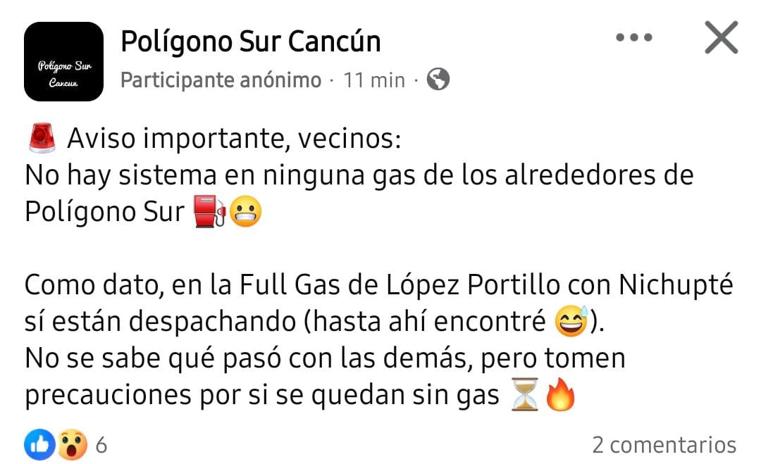 “No hay sistema en ninguna gas de los alrededores de Polígono Sur. Solo en la Full Gas de López Portillo con Nichupté sí están despachando.”