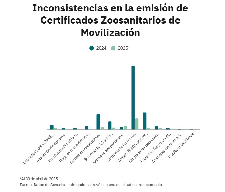 También se encontró que los veterinarios no cumplieron con la documentación establecida en la normativa vigente y presentaron dictámenes o constancias vencidas. La dependencia documentó, además, semovientes sin identificación oficial o no relacionados con la documentación zoosanitaria, así como conflicto de interés.