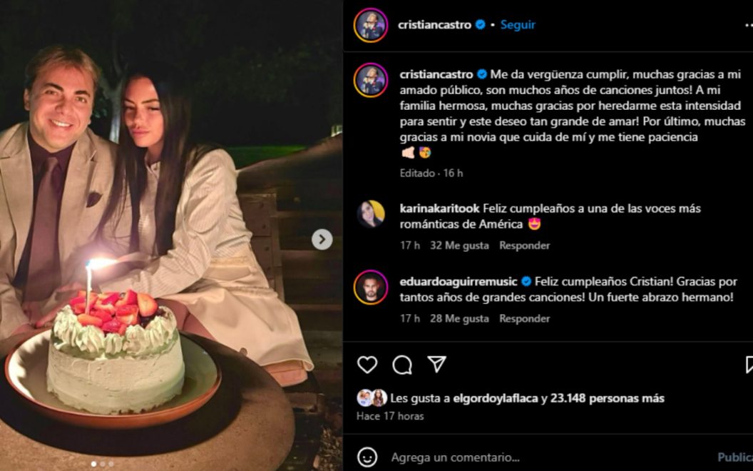 Echando por tierra los rumores de una supuesta separación, Cristian le dedicó unas palabra a Mariela a quien le agradeció temple y tolerancia:  “Por último, muchas gracias a mi novia que cuida de mí y me tienen paciencia”, se lee en la publicación con la que alcanzó más de 23 mi likes y un sinfín de comentarios de felicitación, en scomo el mensaje de Ana Bárbara.