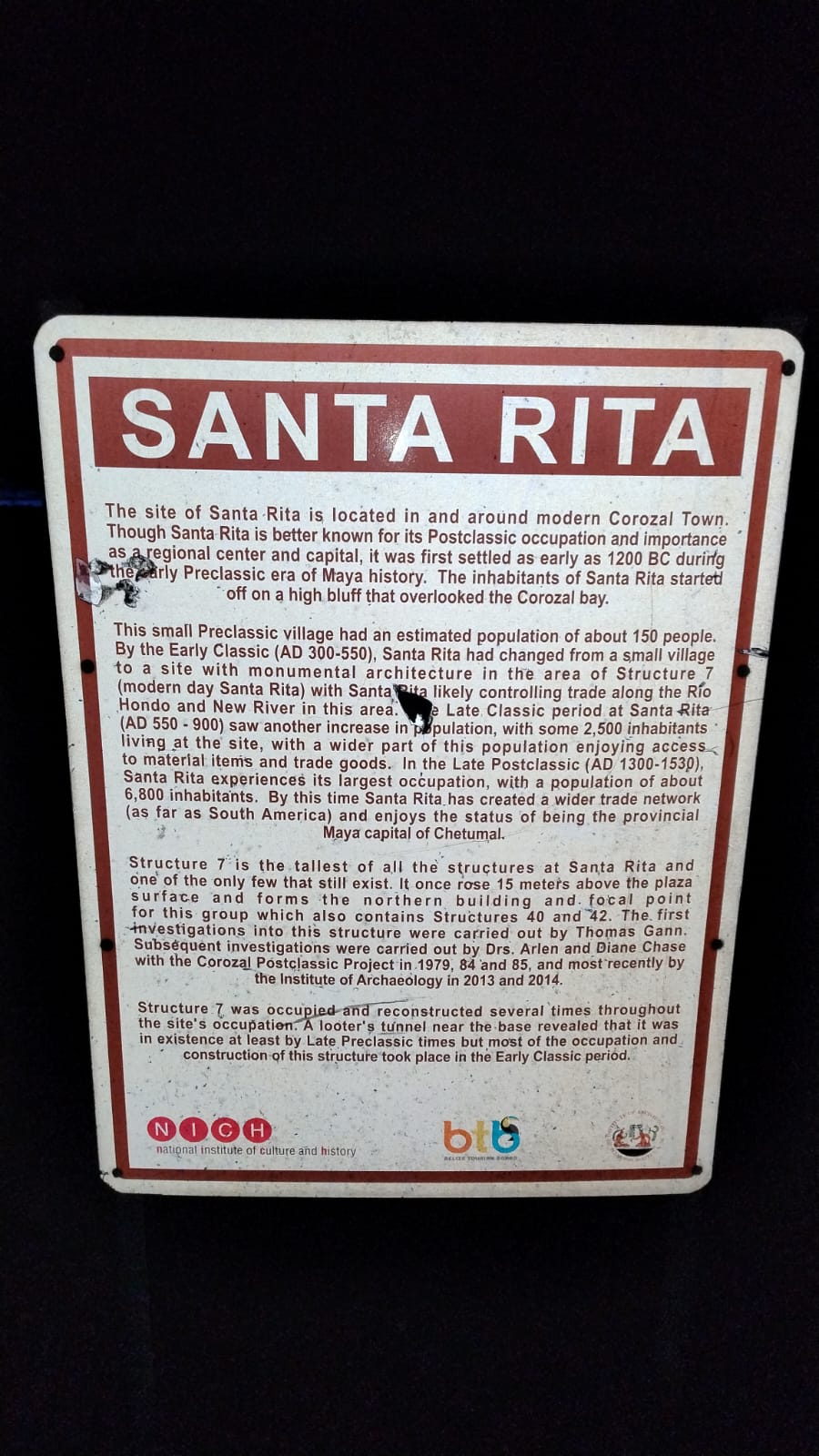 En Santa Rita, la placa colocada por el Instituto Nacional de Cultura e Historia de Belice dice que el monumento hoy rodeado por la ciudad de Corozal es vestigio de un asentamiento que comenzó como aldea alrededor del año 1200 antes de Cristo, durante el Preclásico de la historia maya, y para el Clásico Temprano (300-550 después de Cristo), había pasado de ser una pequeña aldea a un sitio con arquitectura monumental en el área de la Estructura 7, la pirámide que queda como único vestigio.