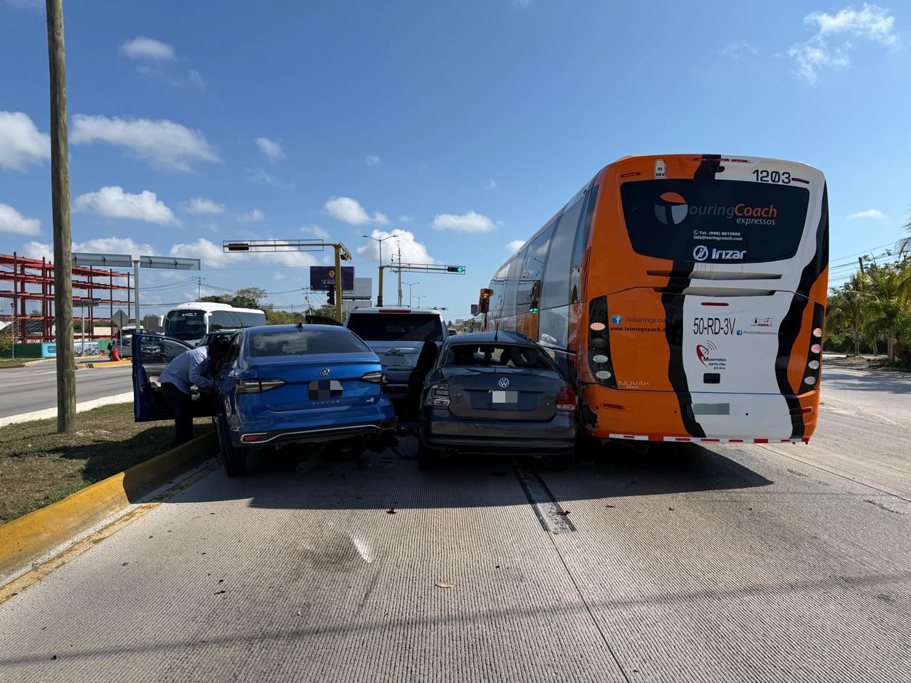 Cancún, 18 de mayo.- Un aparatoso accidente de tránsito que involucró a cuatro vehículos se registró la mañana de este domingo en el bulevar Colosio, a la altura del fraccionamiento Residencial Campestre. A pesar del impacto múltiple, no se reportaron personas lesionadas.