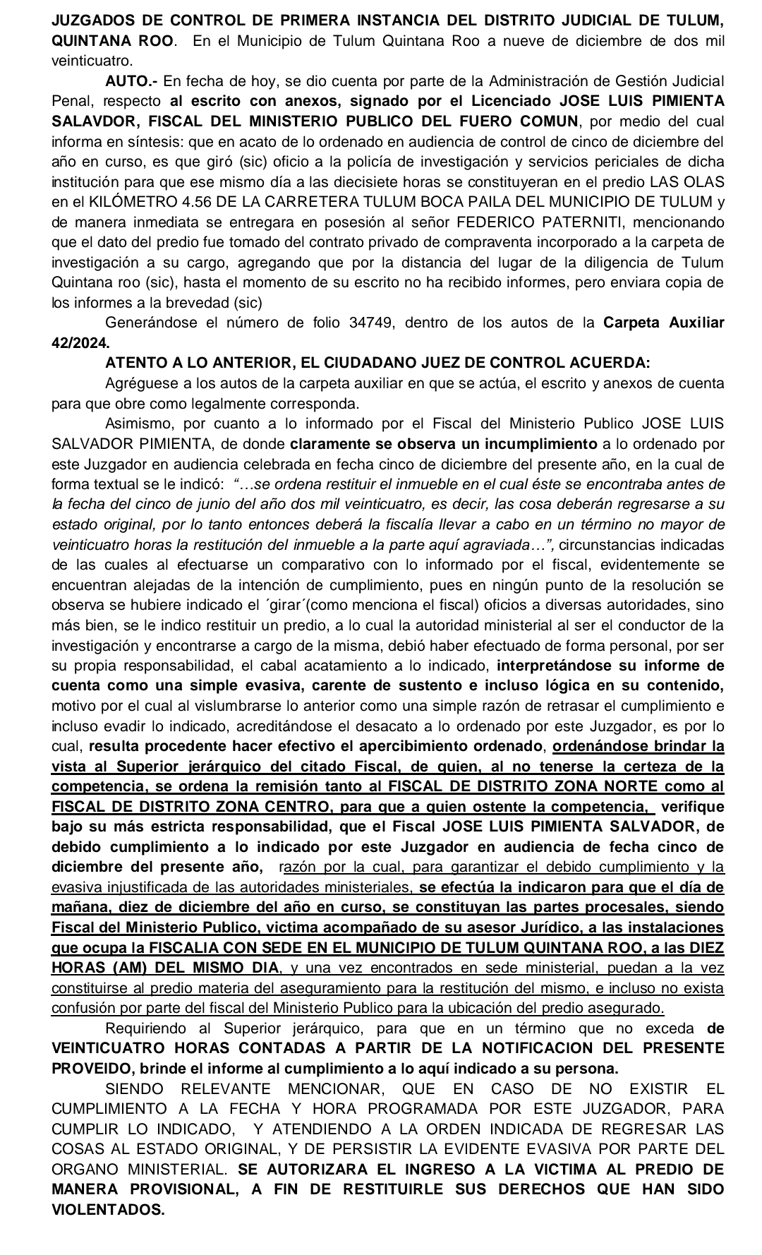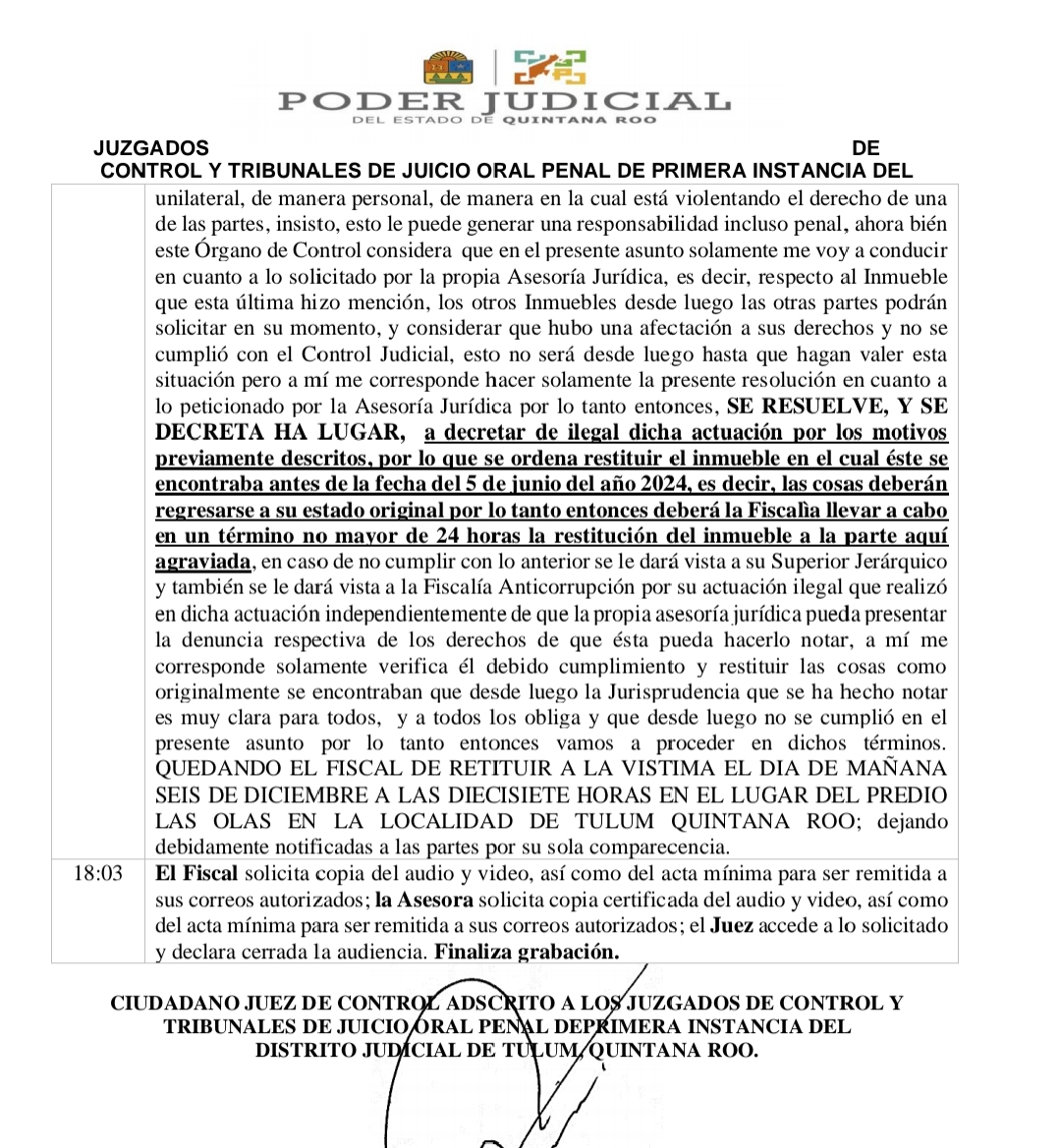 Además, se instruyó que el 10 de diciembre a las 10:00 a.m., las partes procesales, incluido el fiscal Pimienta Salvador, se reúnan en las instalaciones de la Fiscalía en Tulum y procedan directamente al predio para garantizar la restitución del inmueble. Se notificó tanto al Fiscal de Distrito Zona Norte como al Fiscal de Distrito Zona Centro para que supervisen el cumplimiento estricto de la orden.