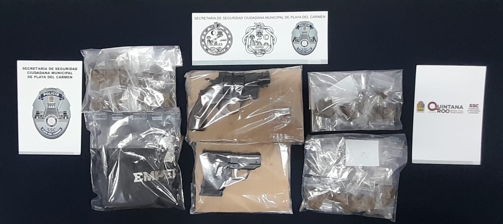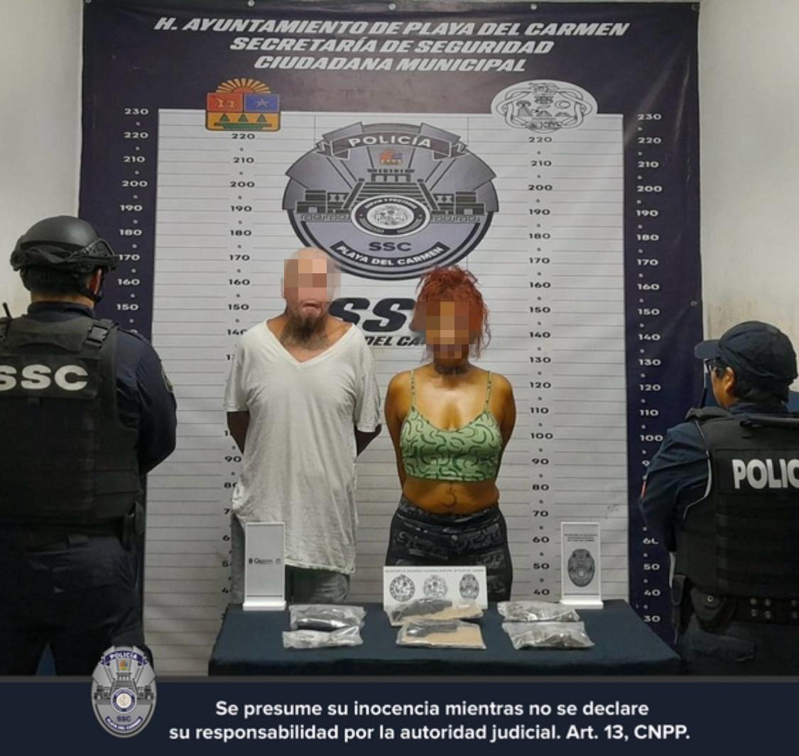 Al intentar huir, fueron interceptados con apoyo de elementos de la Policía Estatal. Durante la inspección se aseguraron diversos envoltorios de vegetal verde y seco con características de marihuana, un arma de fuego con dos cartuchos y una réplica de arma. Los ahora detenidos fueron identificados como: Corbin “N”, de 48 años, originario de Estados Unidos, y Nayeli “N”, de 30 años, originaria de Tabasco.