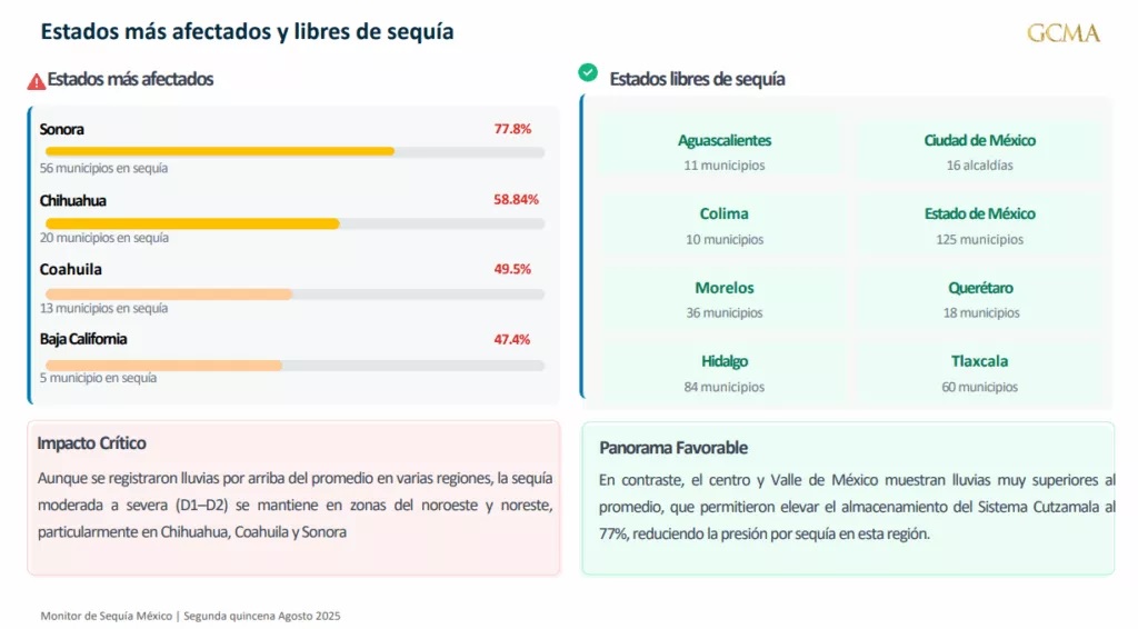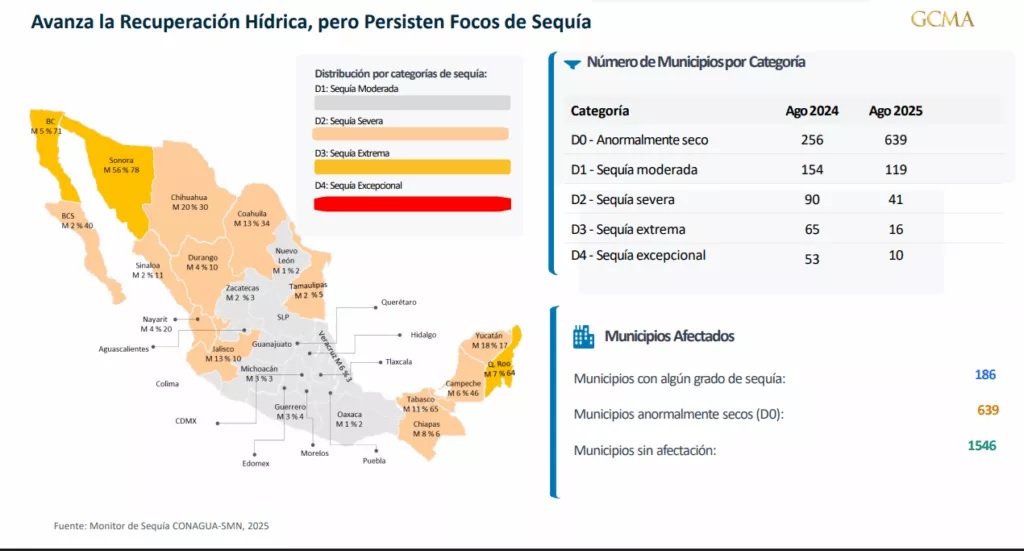 Entre agosto de 2024 y agosto de 2025 se registró una reducción significativa en la extensión de sequía en México: