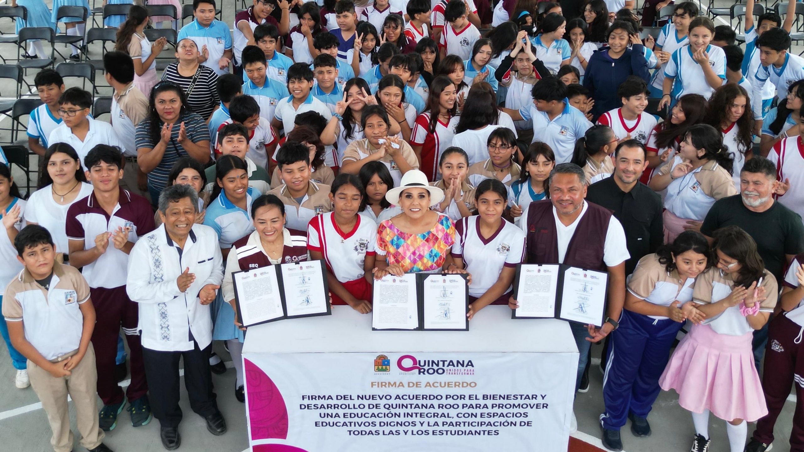 Durante el evento también se formalizó la firma del Nuevo Acuerdo entre la gobernadora Mara Lezama y la secretaria de Educación, Elda Xix Euán, y el secretario de Obras Públicas, José Rafael Lara Díaz, con el propósito de transformar el modelo de desarrollo educativo más justo, inclusivo y sostenible, reduciendo las brechas de desigualdad, promoviendo una educación que beneficie a cada uno de los jóvenes con espacios educativos dignos que van en busca de un mejor futuro.
